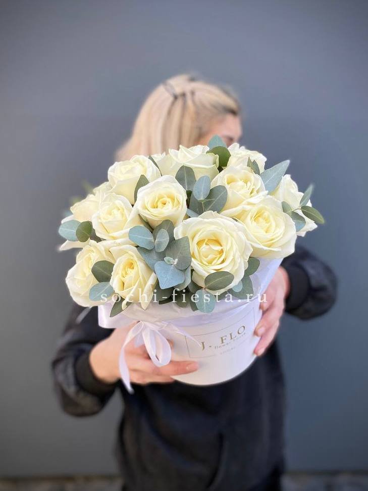 белые розы с эвкалиптом в боксе 16.