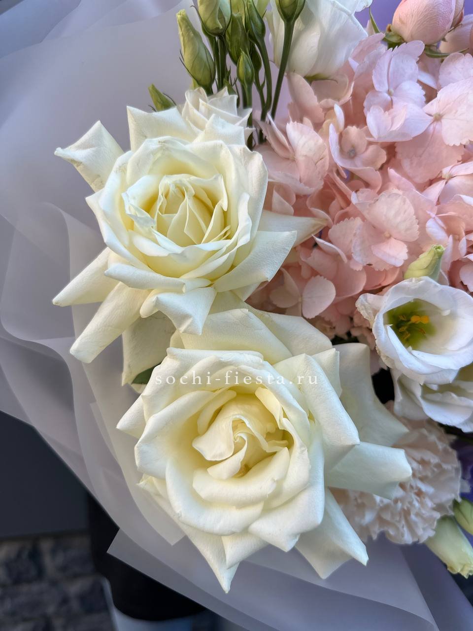 гортензия нежно-розовых оттенков, эустома, львиный зев или маттиола, розовые розы, эвкалипт, вспомогательная зелень, лента, светлая корзин.