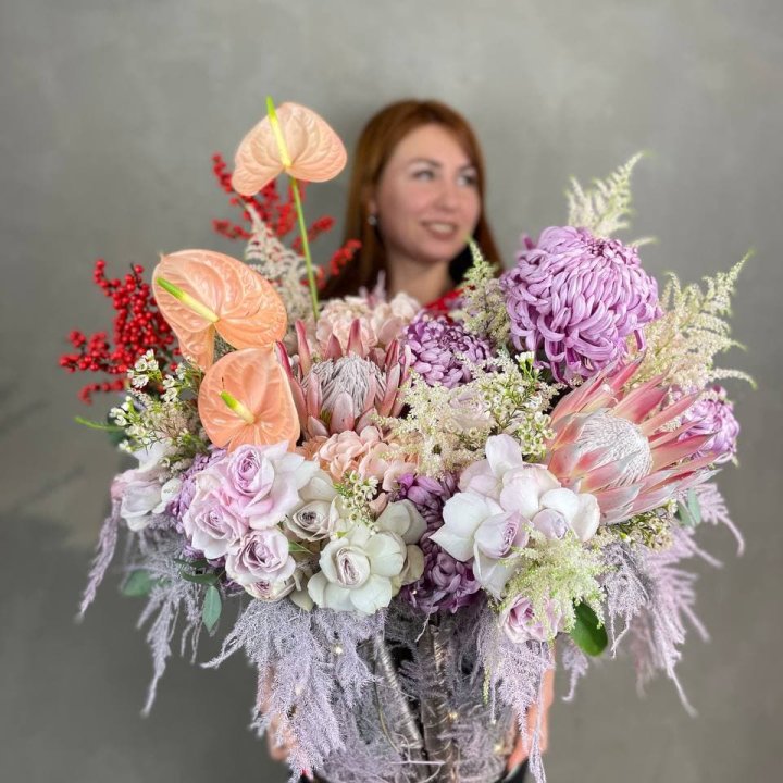 Авторские букеты гиганты в Архангельске — формат для тех событий в жизни города, когда обычного букета недостаточно. Юбилей 50 лет, свадьба, открытие бизнеса, значимое корпоративное поздравление — именно к таким поводам клиент заказывает гигантский авторский букет, который невозможно не заметить. Флорист в Архангельске создаёт авторские букеты гиганты из 101 и более роз, пионовые гиганты в сезоне, корзины-гиганты для торжественных вручений. Именно масштаб флористического жеста делает момент незабываемым для получателя и всех присутствующих.
