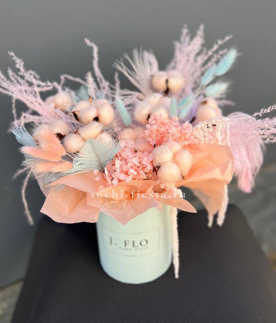 Воздушная композиция с пушистым лагурусом и хлопковыми коробочками в цилиндре. Перья добавляют легкости, амарант уравновешивает общий ритм. Сохраняет форму месяцами.