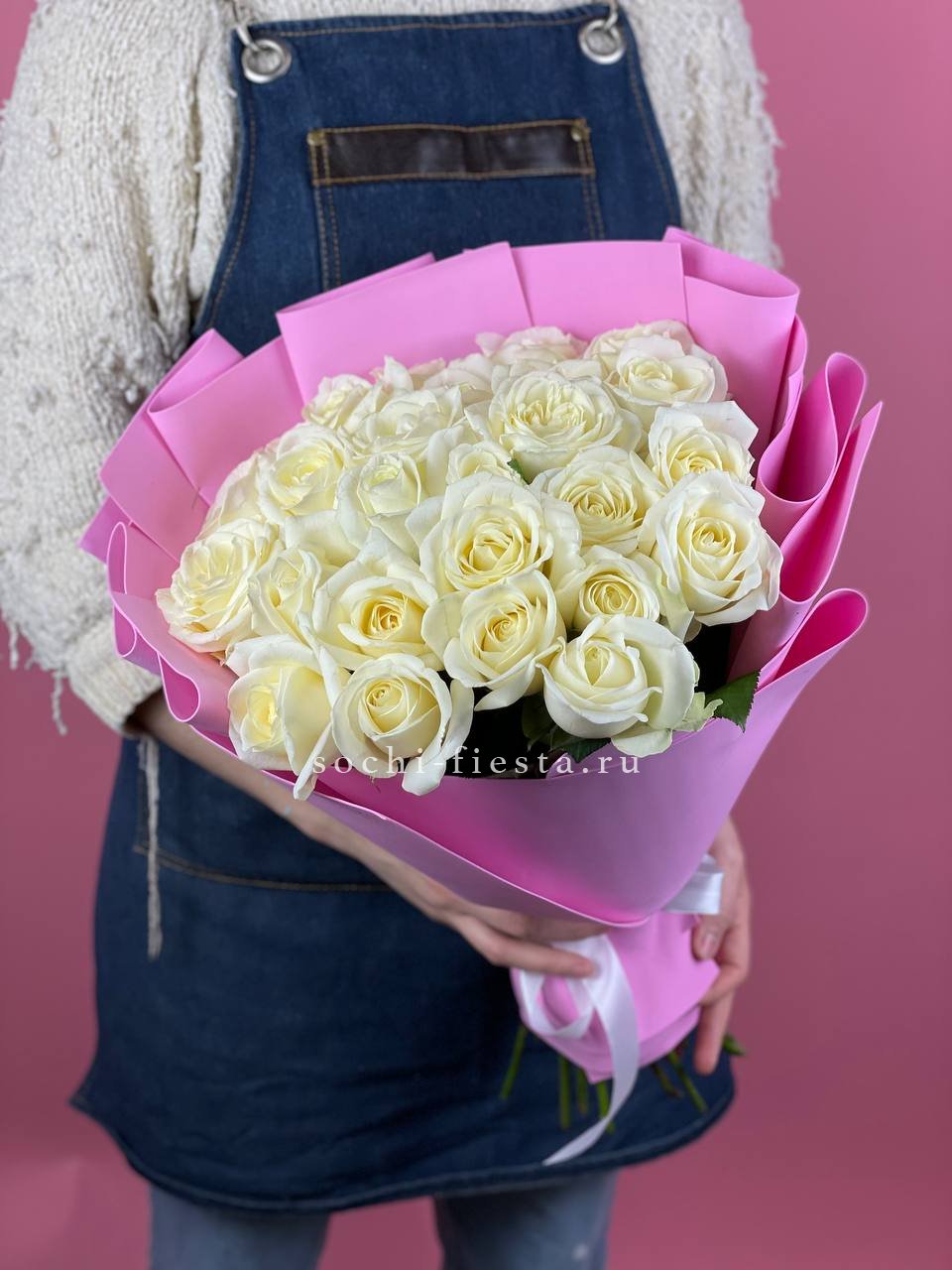 Белоснежные бутоны собраны в лаконичную форму с воздушной текстурой упаковки. Чистота линий и свежесть делают композицию универсальной для любого момента.