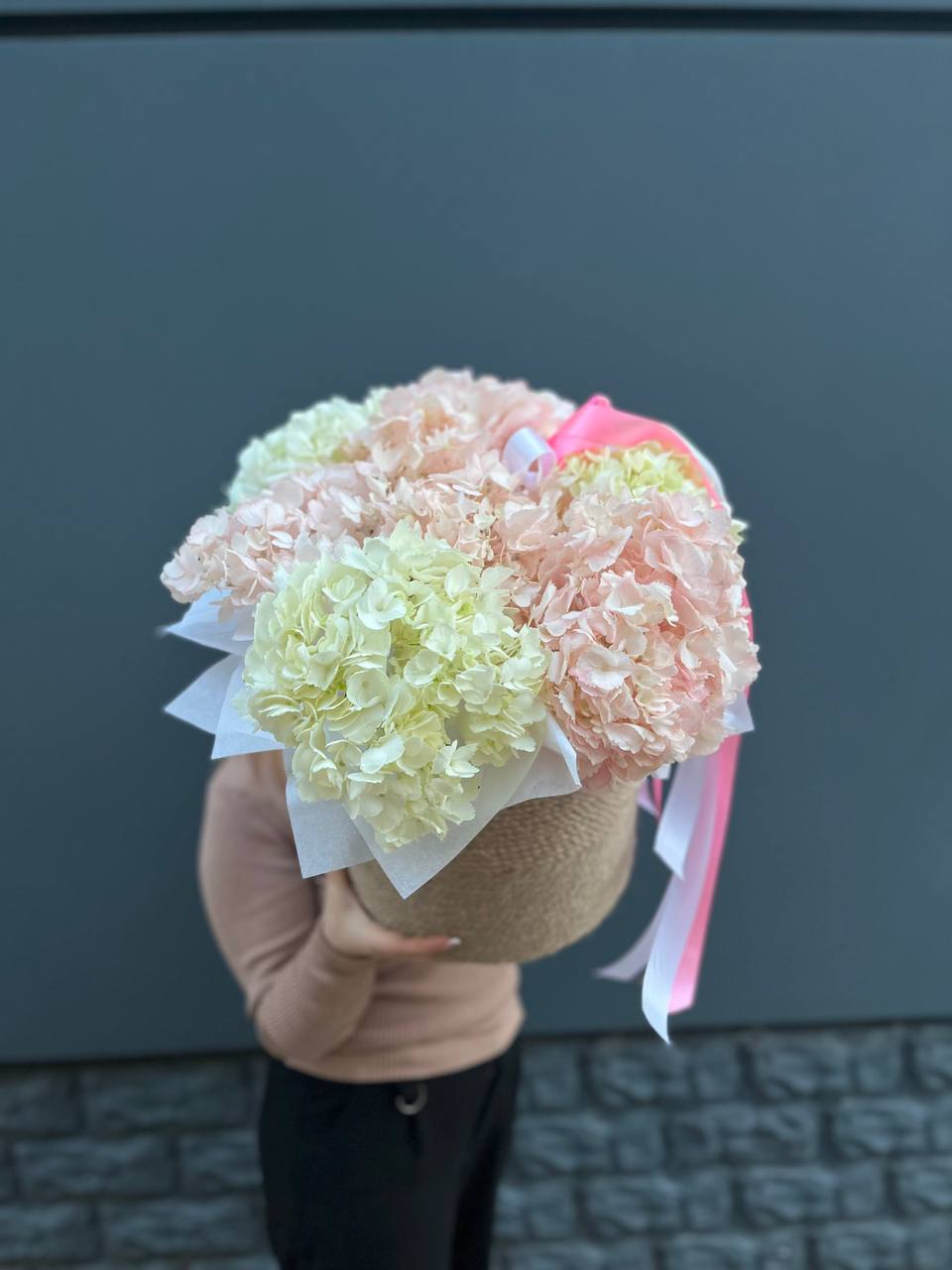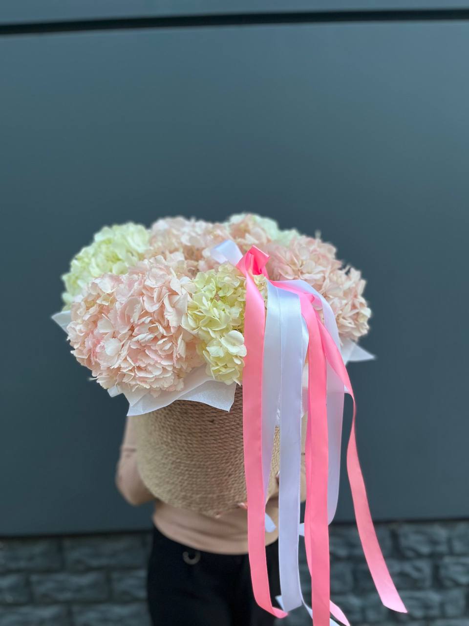 Многослойная композиция с герберами, эустомой и гортензией образует плавные переходы оттенков. Антиринум вытягивает силуэт вверх, придавая букету лёгкость и воздушность.
