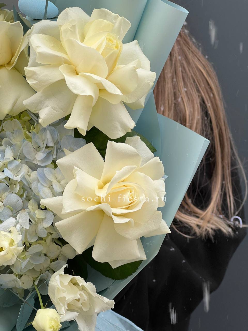 Семь пышных шапок гортензий переливаются от белого к розовому оттенку. Объёмная композиция заполняет собой всё вокруг и притягивает взгляд своей воздушной фактурой.
