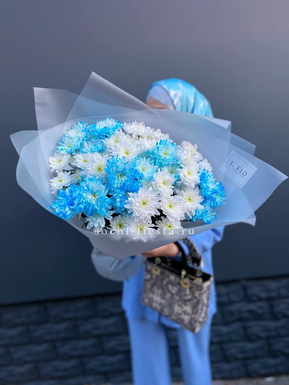 Одиннадцать кустовых хризантем окрашены в холодный голубой оттенок и собраны в плотную композицию. Каждая ветка раскрывается множеством бутонов, создавая объёмную шапку цвета зимнего неба.