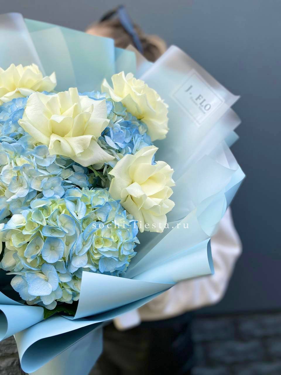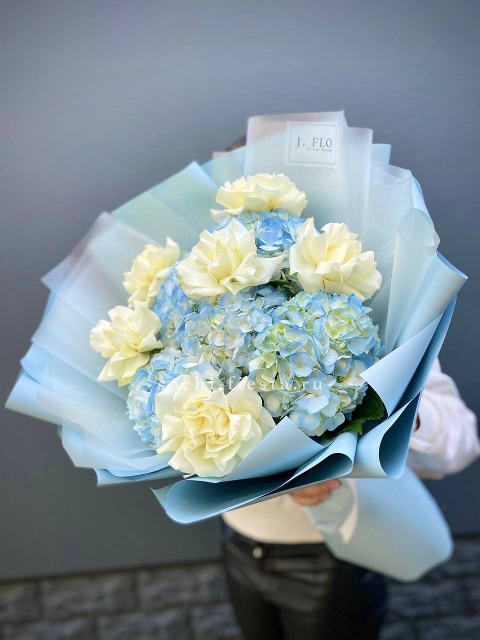 Воздушные шапки гортензий создают объёмную основу, а белые розы добавляют графичности. Голубой оттенок освежает композицию и делает её запоминающейся.