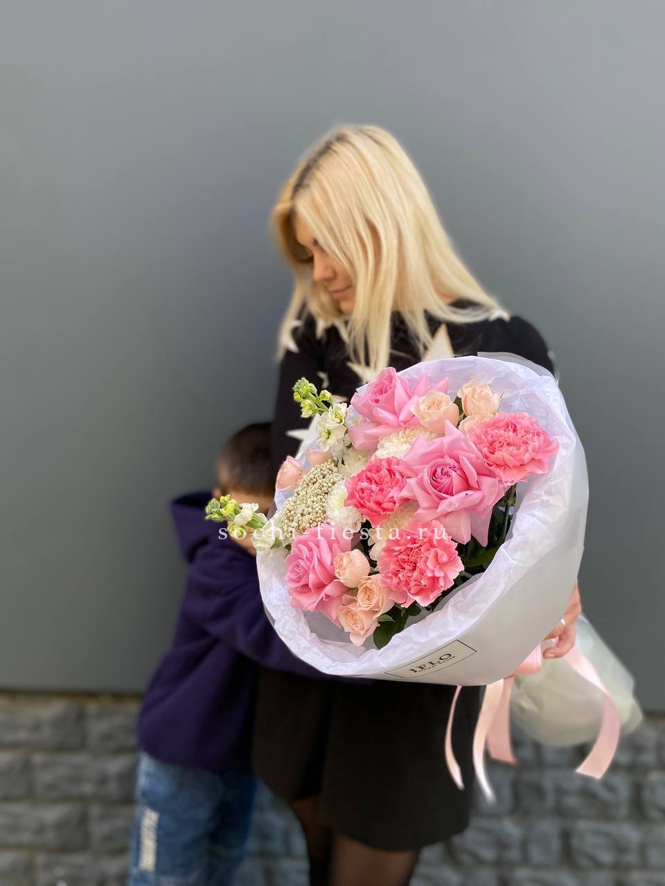 букет из нежных стойких цветов диантусов, роз, хризантем, маттиолы(возможна замена на эустому), озатамуса, бомбастика в воздушном оформлении.