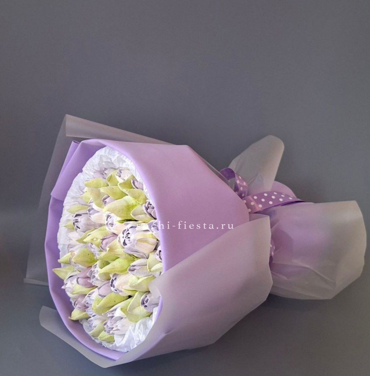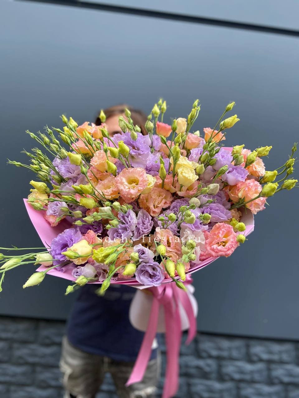 Сто один стебель белоснежной эустомы с многоярусными бутонами собраны в воздушный букет. Каждый цветок напоминает миниатюрную розу и вместе они образуют лёгкую скульптурную форму.