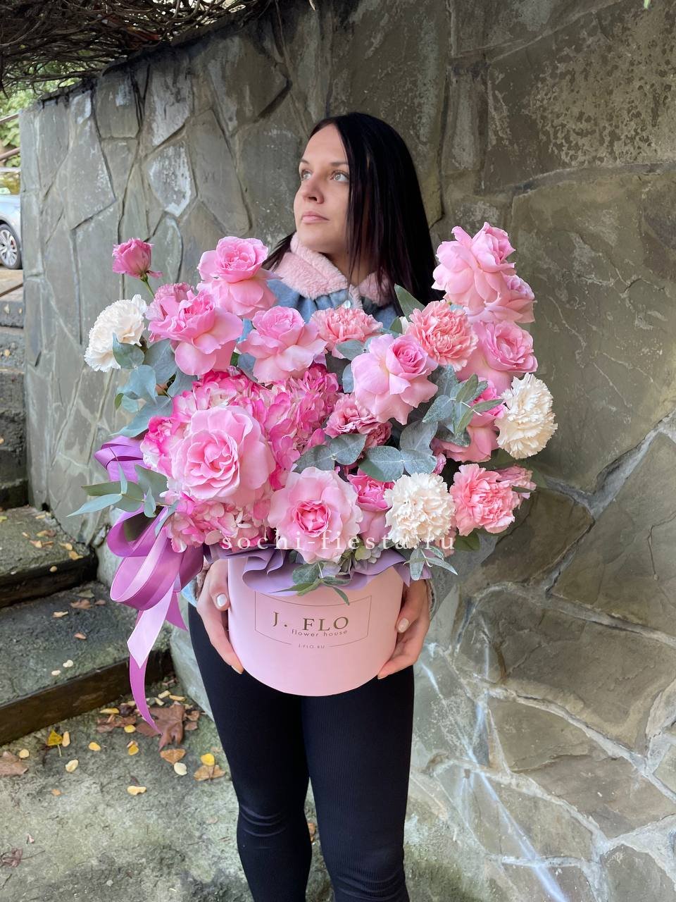Пышная гортензия задает объем, а французские розы и эустома создают многослойную глубину. Диантусы добавляют графичные точки, эвкалипт обрамляет композицию мягкими линиями.