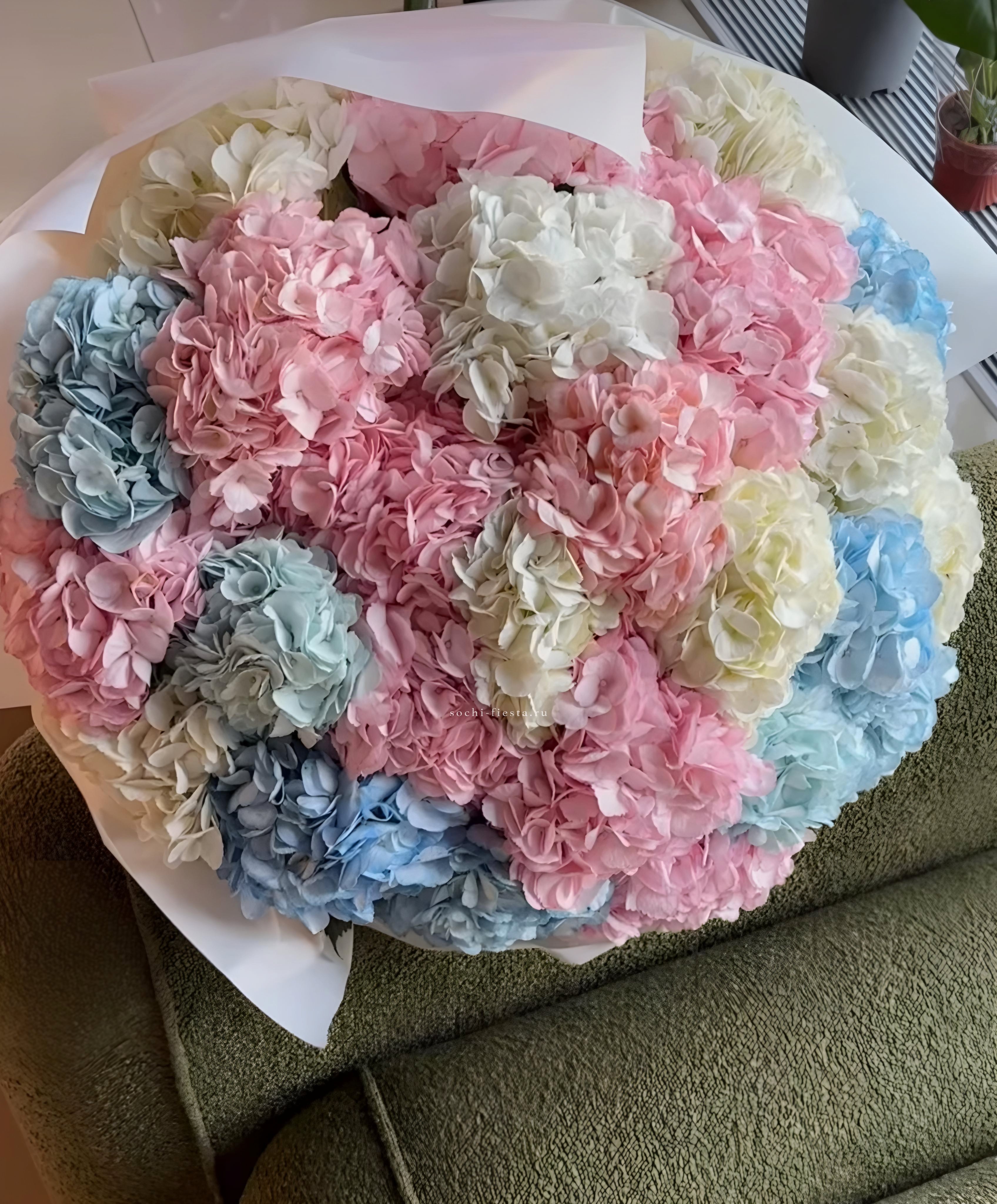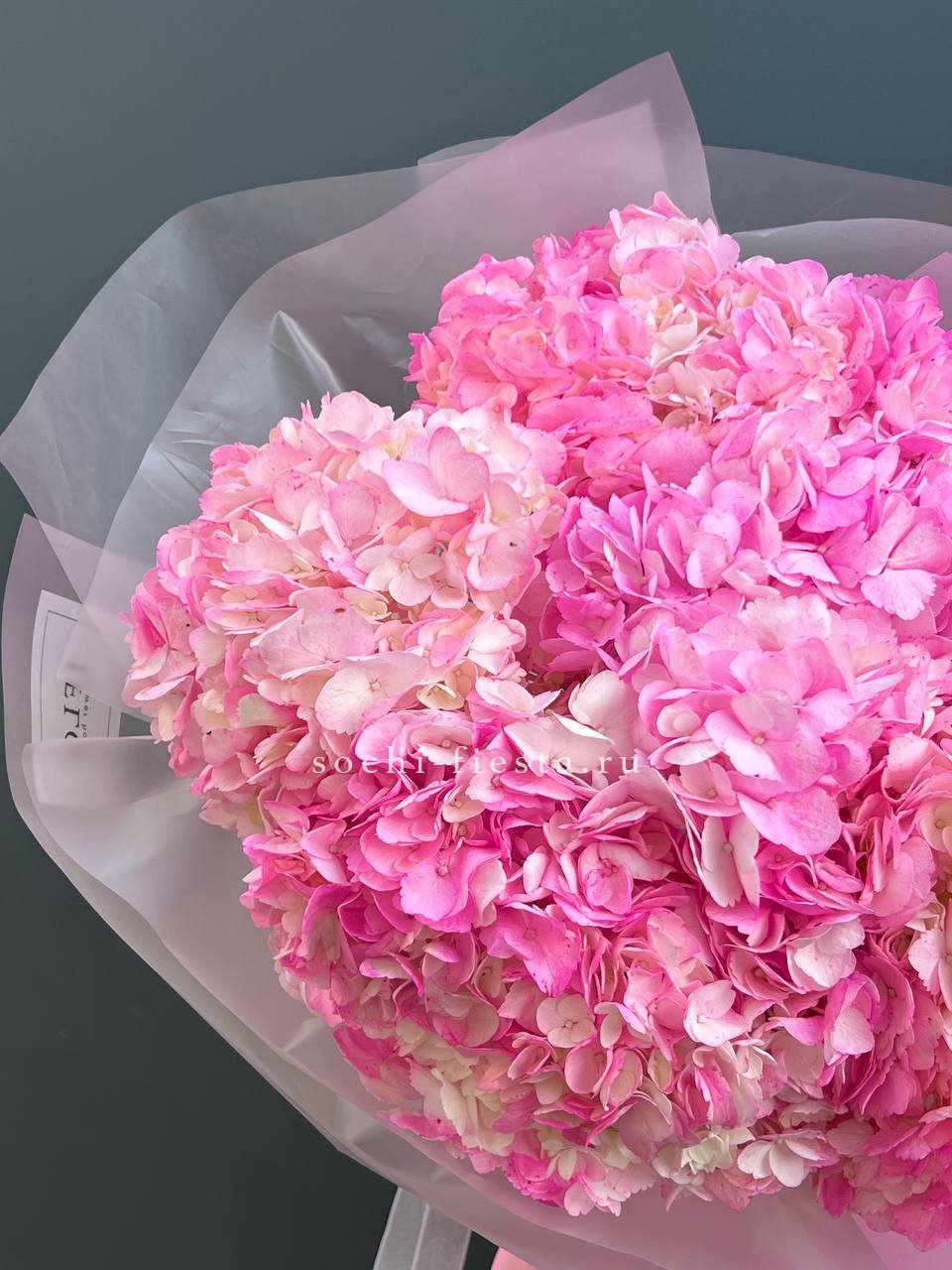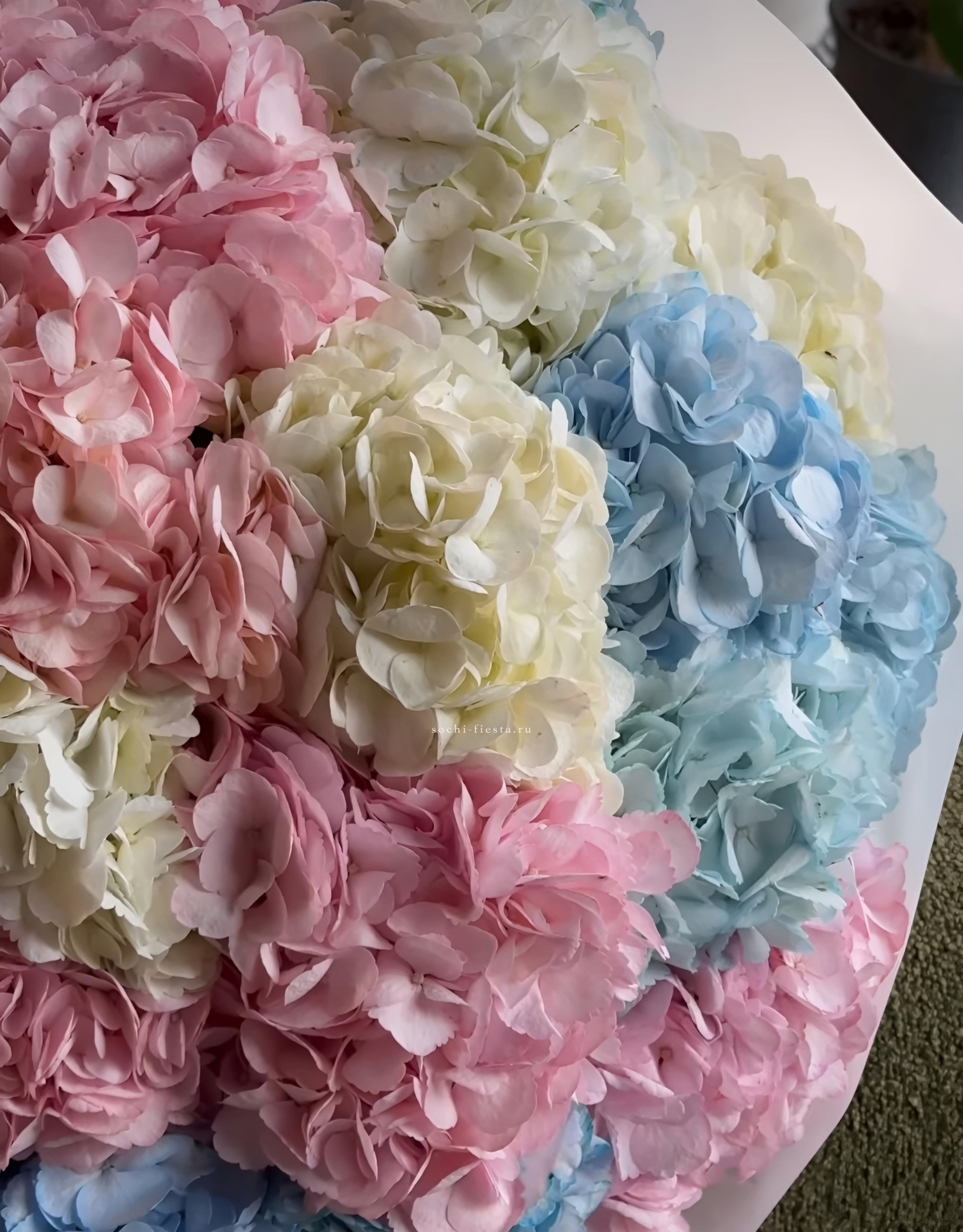 Букет из семи гортензий объединяет разные оттенки в единую композицию с живым ритмом. Переходы цвета создают динамику, а плотные соцветия формируют выразительный объём.