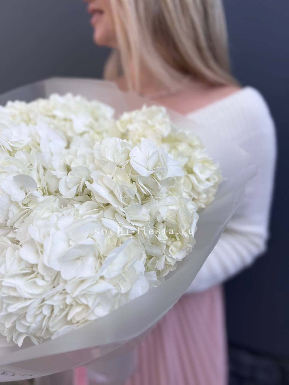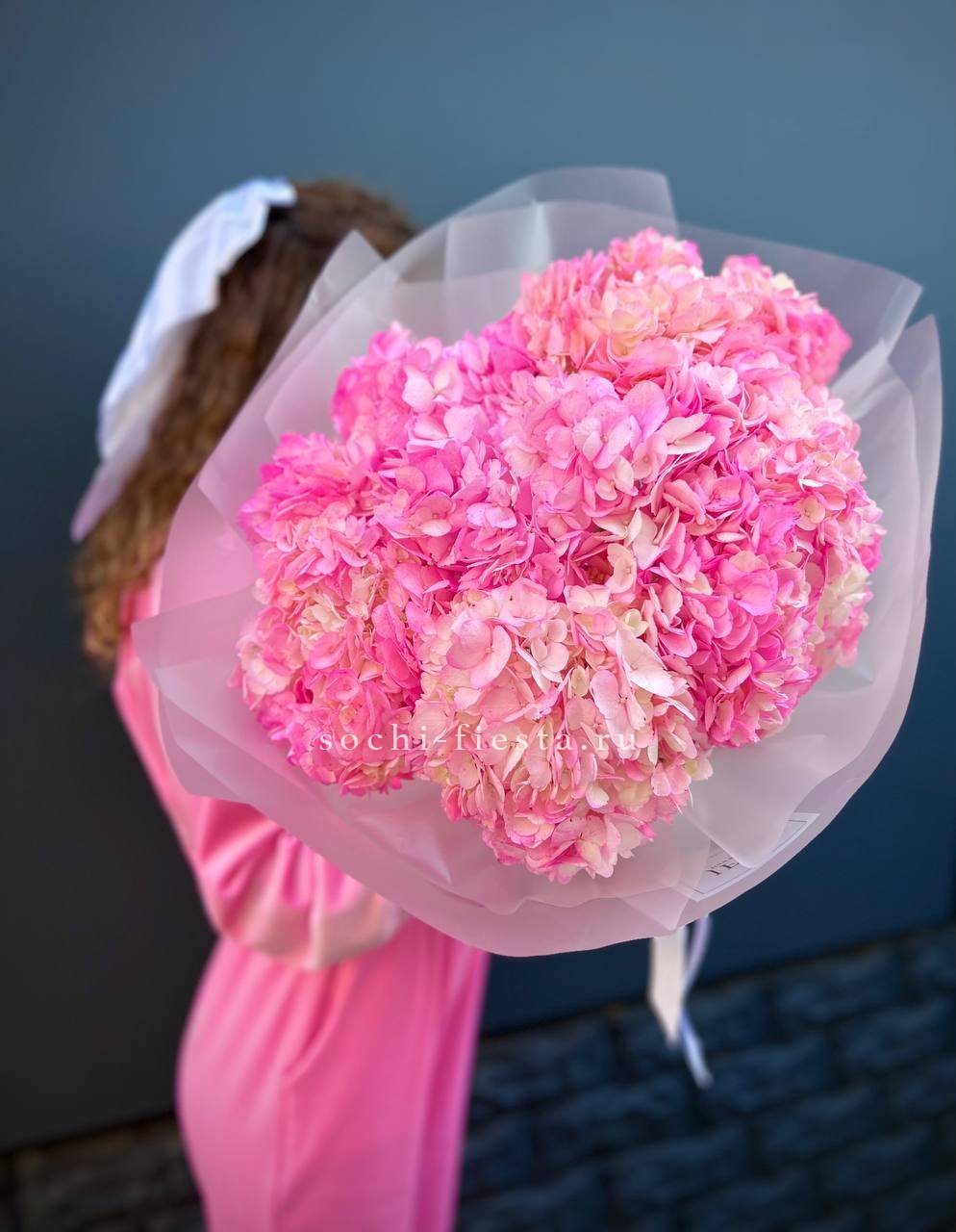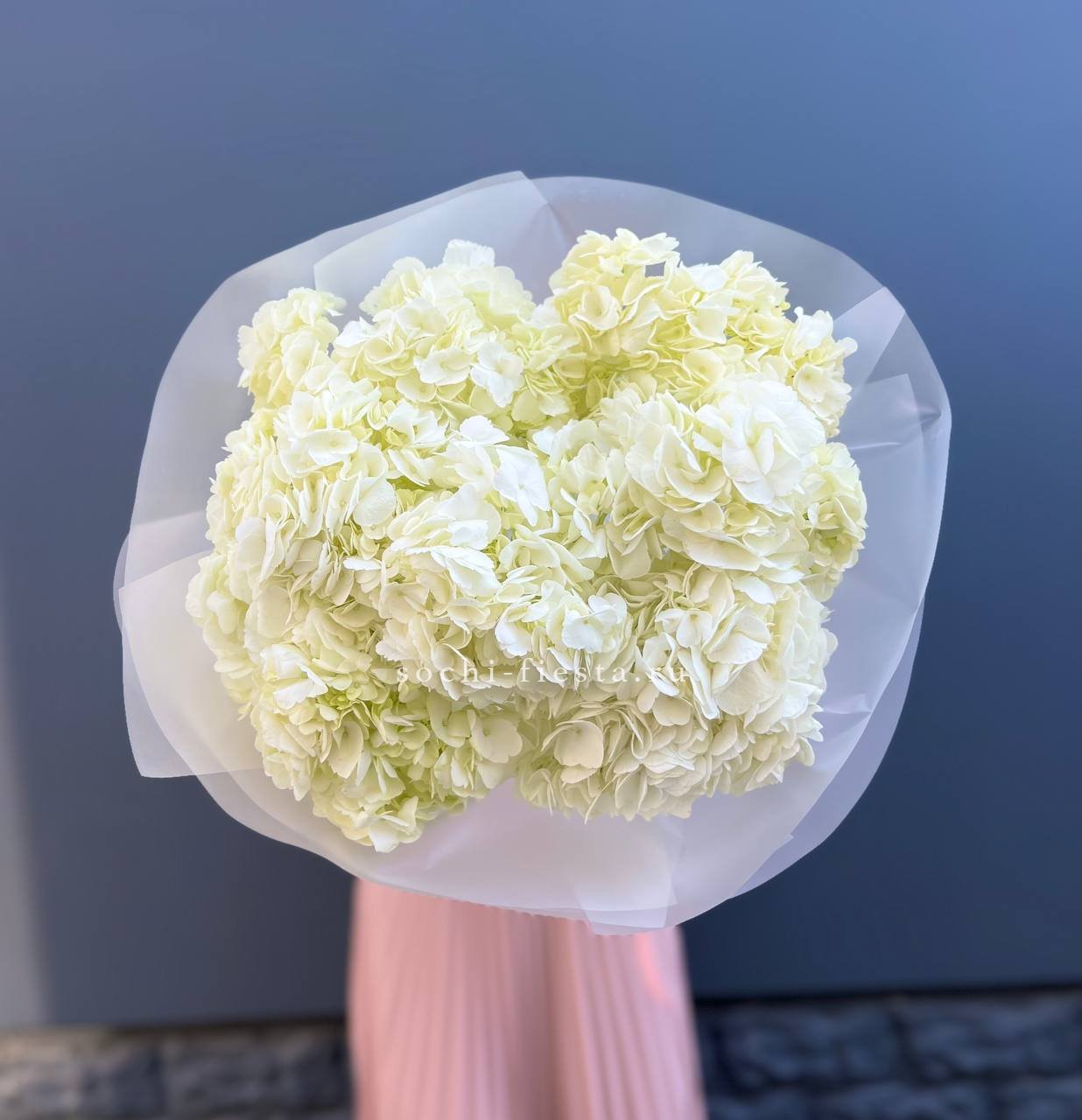 гортензия, лента, зелень по наличию, дизайнерская упаковка.
