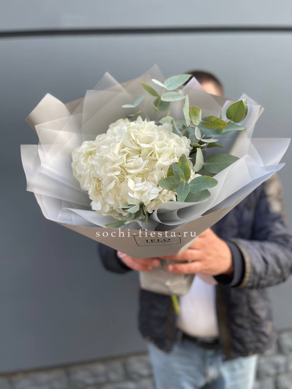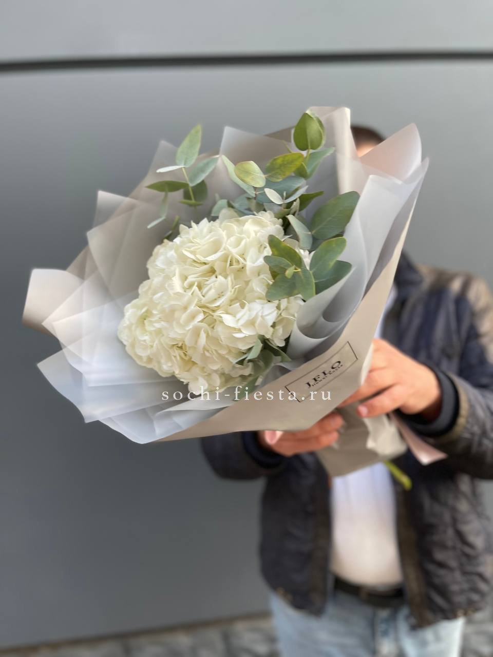 Воздушные шапки соцветий собраны в пышную охапку белоснежного цвета. Гортензия создаёт объёмную текстуру и заполняет пространство мягким природным светом. Букет для тех, кто ценит чистоту линий и естественную красоту.