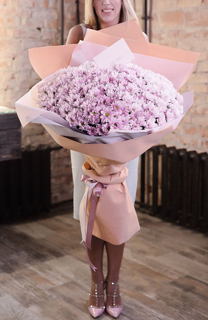 минимальный состав: 11 одноголовых хризантем, лента, упаковка на выбор.