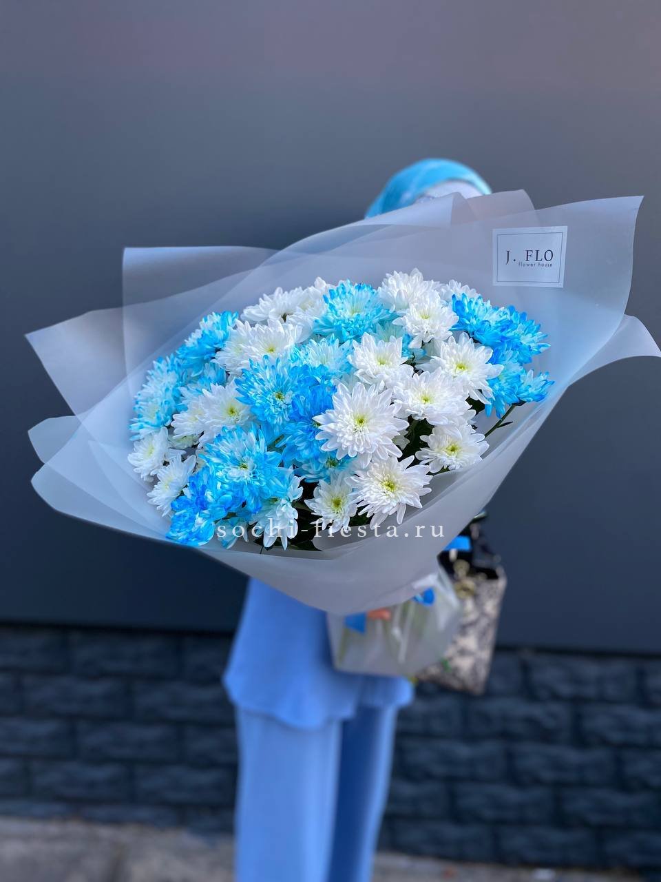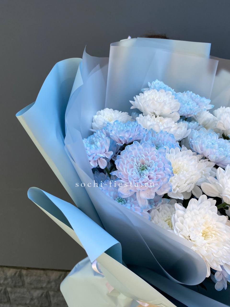 Одиннадцать крупных хризантем Cassiopeia собраны в плотный букет с выразительным объёмом. Каждый бутон раскрыт полностью, создавая насыщенную текстуру и живую игру света на лепестках.