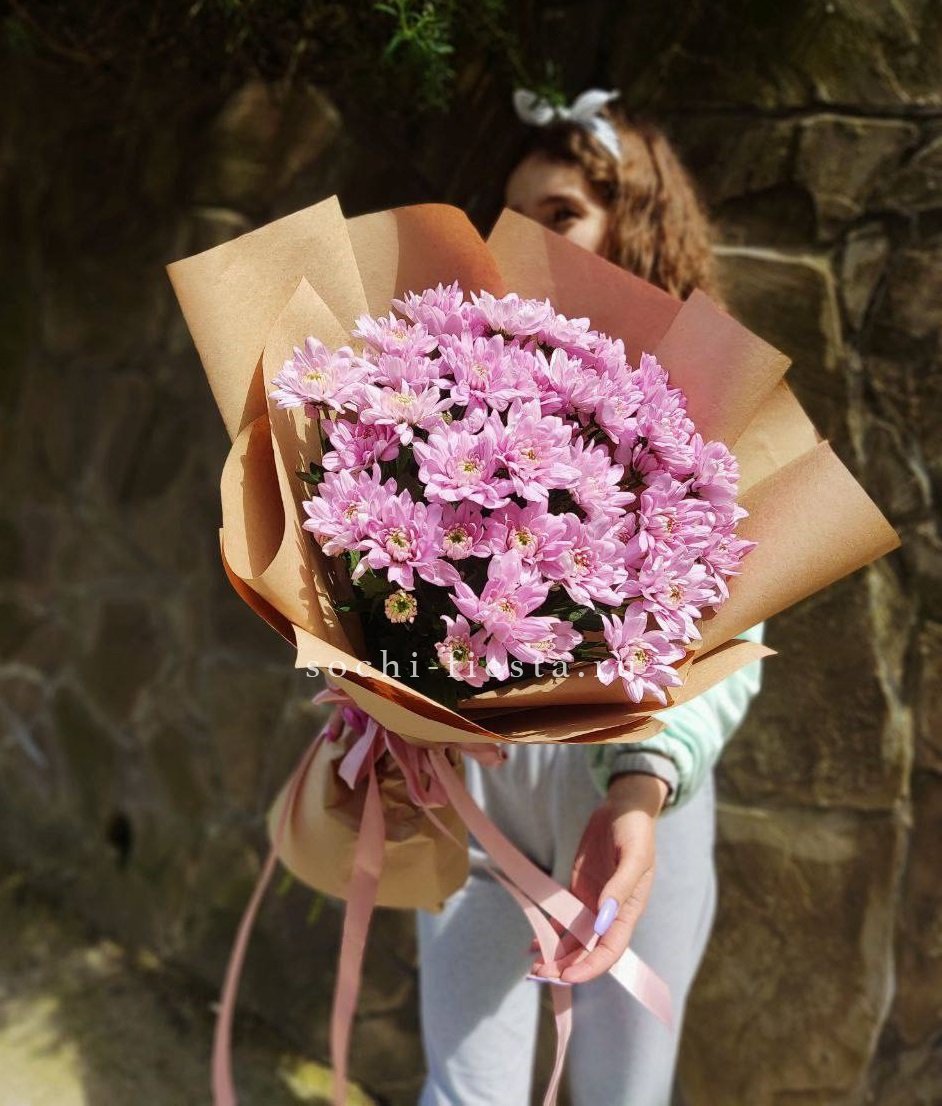 хризантемы - 7 шт, эвкалипт,  лента, дизайнерская упаковка.