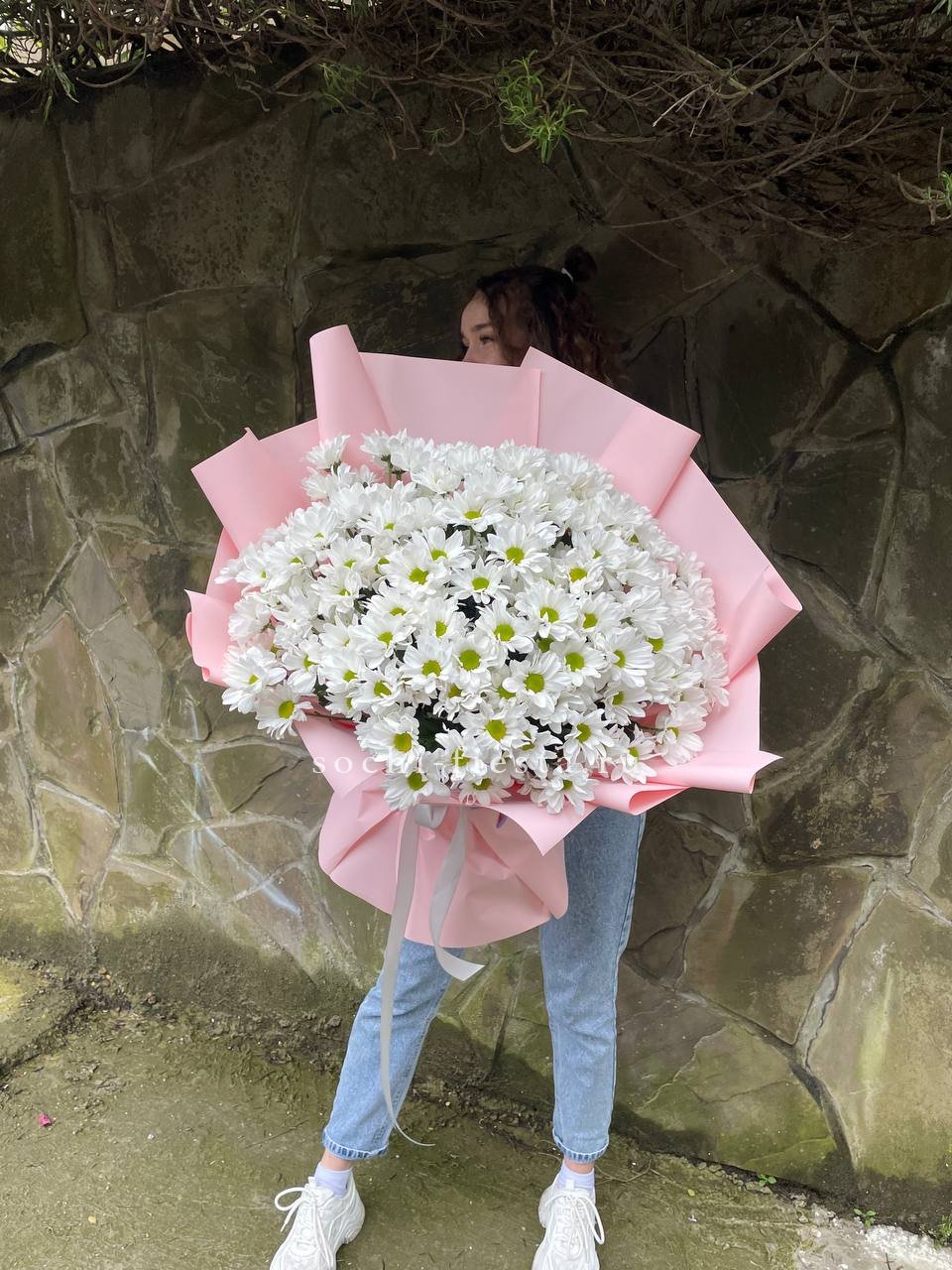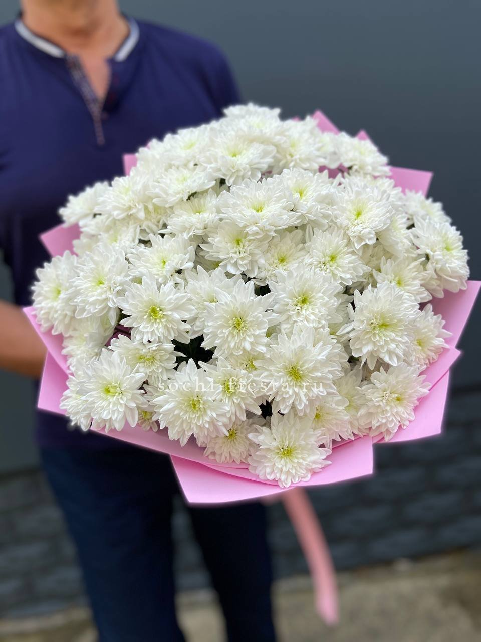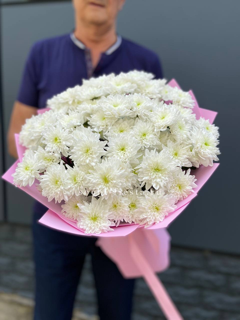 Крупные соцветия одноголовых хризантем раскрываются во всей полноте. Плотные лепестки образуют графичные круги, а сдержанная упаковка сохраняет чистоту формы.