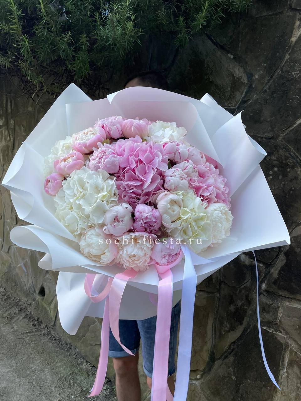 голландские пионы, гортензии, лента, упаковка.