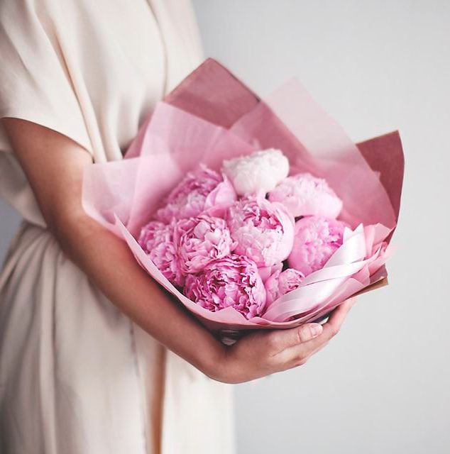 Девять пионов пастельных оттенков в лаконичной авторской подаче. Бутоны подобраны на пике раскрытия, когда лепестки уже показывают всю свою фактуру и объём.