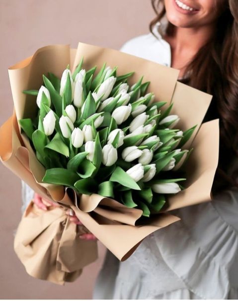 Тридцать семь тюльпанов создают яркое цветовое пятно в любом интерьере. Крафтовая упаковка оставляет композицию открытой и подчёркивает графику стеблей. Букет выглядит свободно и современно.