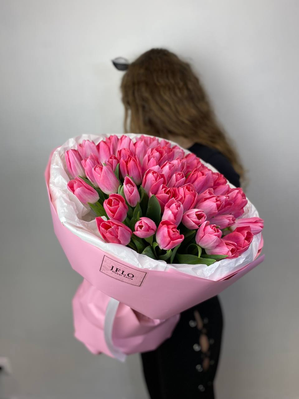Два оттенка розового переплетаются в лаконичном весеннем дуэте. Тюльпаны с их гладкими бутонами дополнены воздушными соцветиями хамелациума.