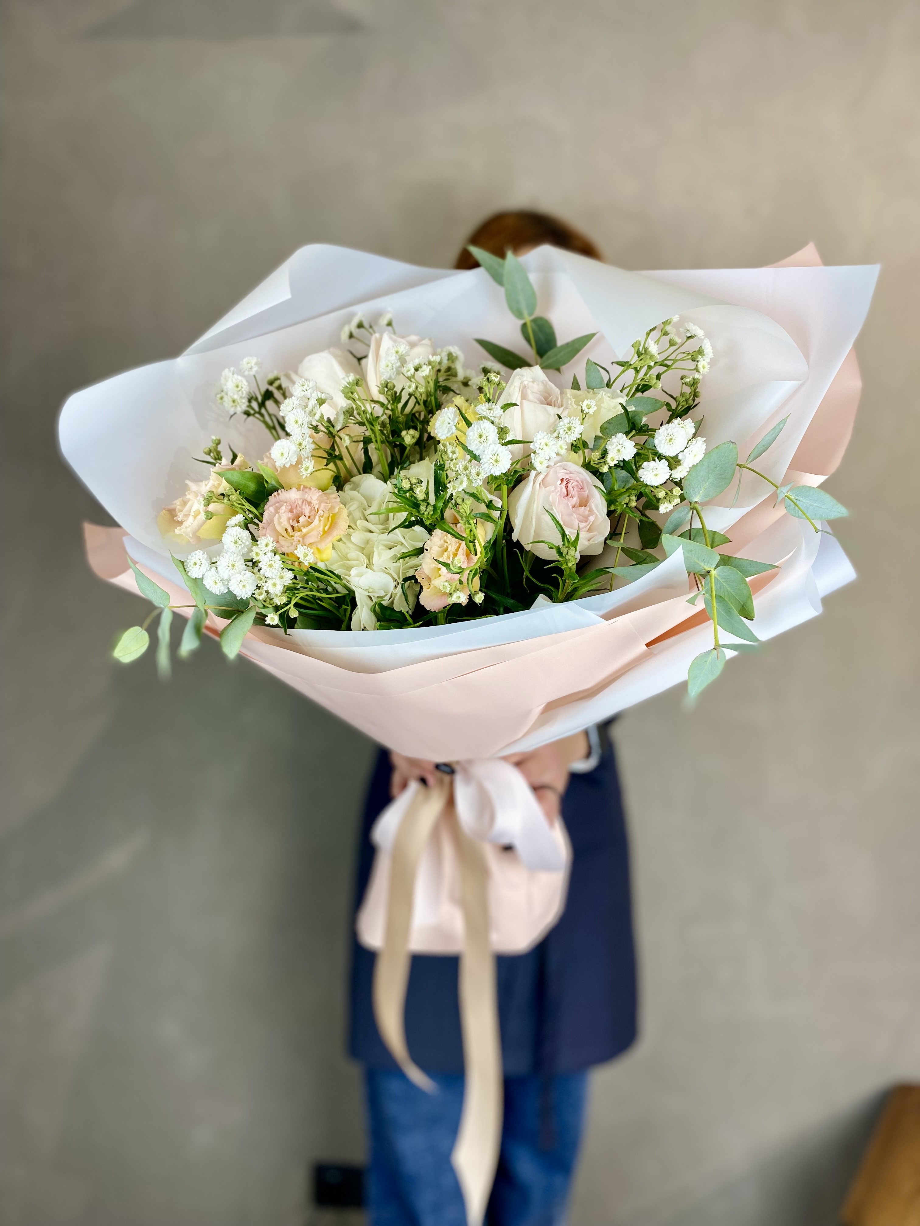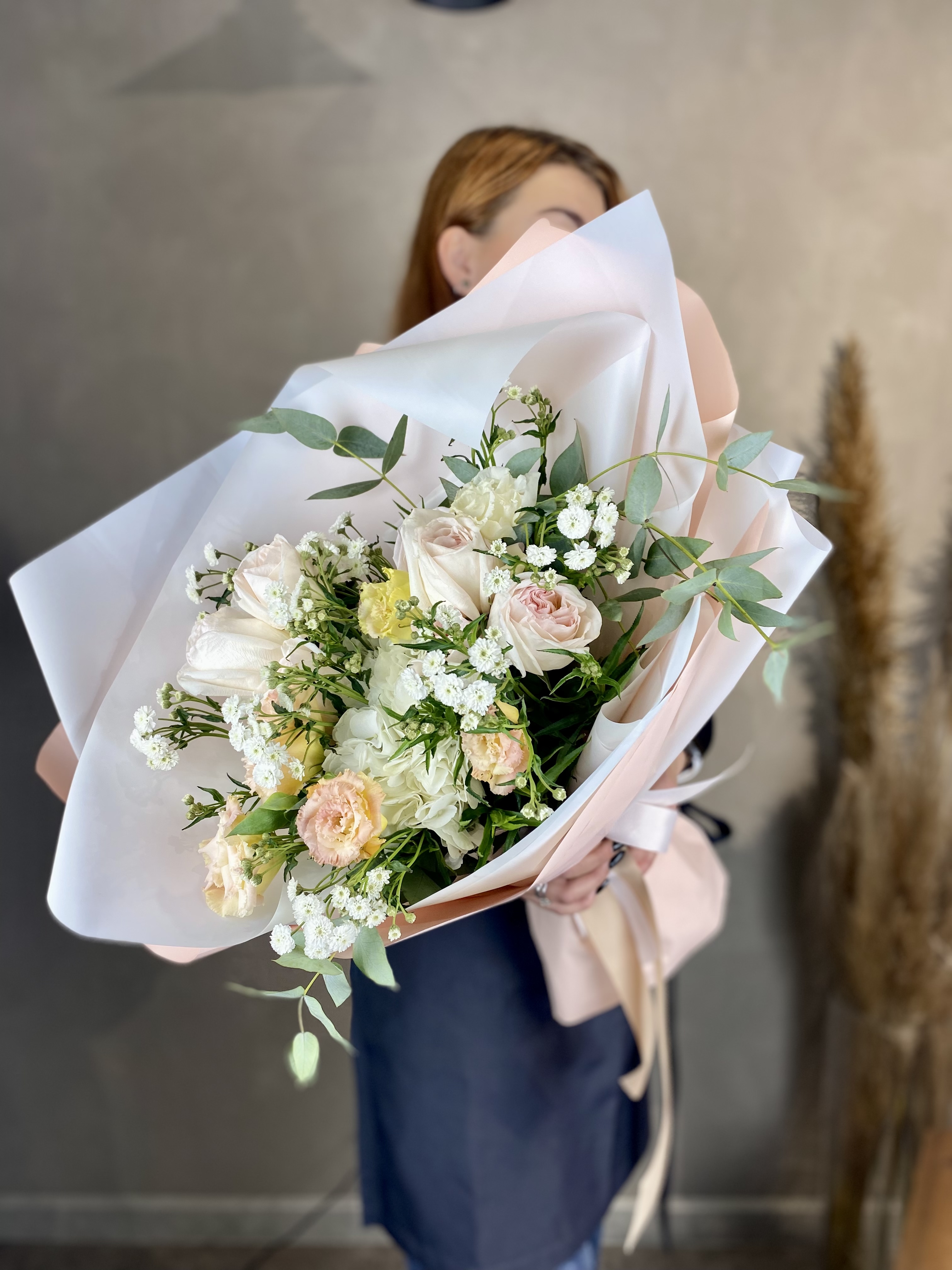Пышная гортензия задает объем, а розы и матtiола выстраивают живописную глубину композиции. Вероника добавляет вертикальные линии, эвкалипт смягчает переходы между соцветиями. Букет с продуманной архитектурой и авторским почерком.