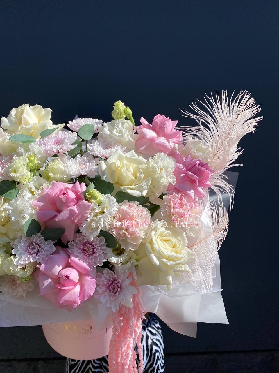 Сочетание вывернутых роз с гортензией, диантусами, розами, бомбастиками создает воздушных элегантный образ идеального цветочного подарка