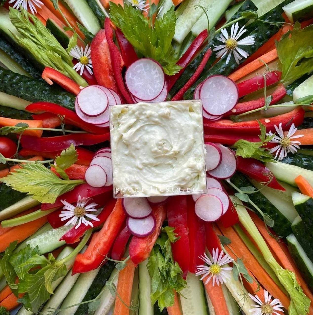 Хрустящие сезонные овощи уложены слоями и дополнены воздушным муссом из кальмара и авокадо. Щедрая подача на компанию до десяти человек создаёт ощущение лёгкости и свежести.