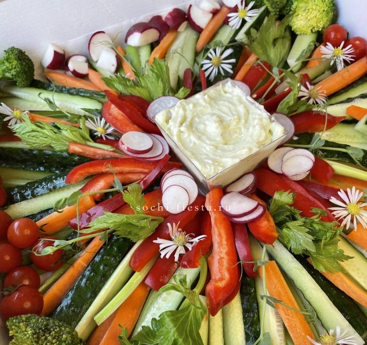 сезонные овощи с муссом из кальмара и авокадо. Щедро уложены в несколько слоев. Вес 2-2,5 кг. Бокс рассчитан на 8-10 персон.