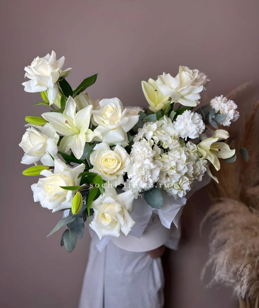 вывернутые белые розы, цилиндр D16, лимониум, эвкалипт,  лента, упаковка.