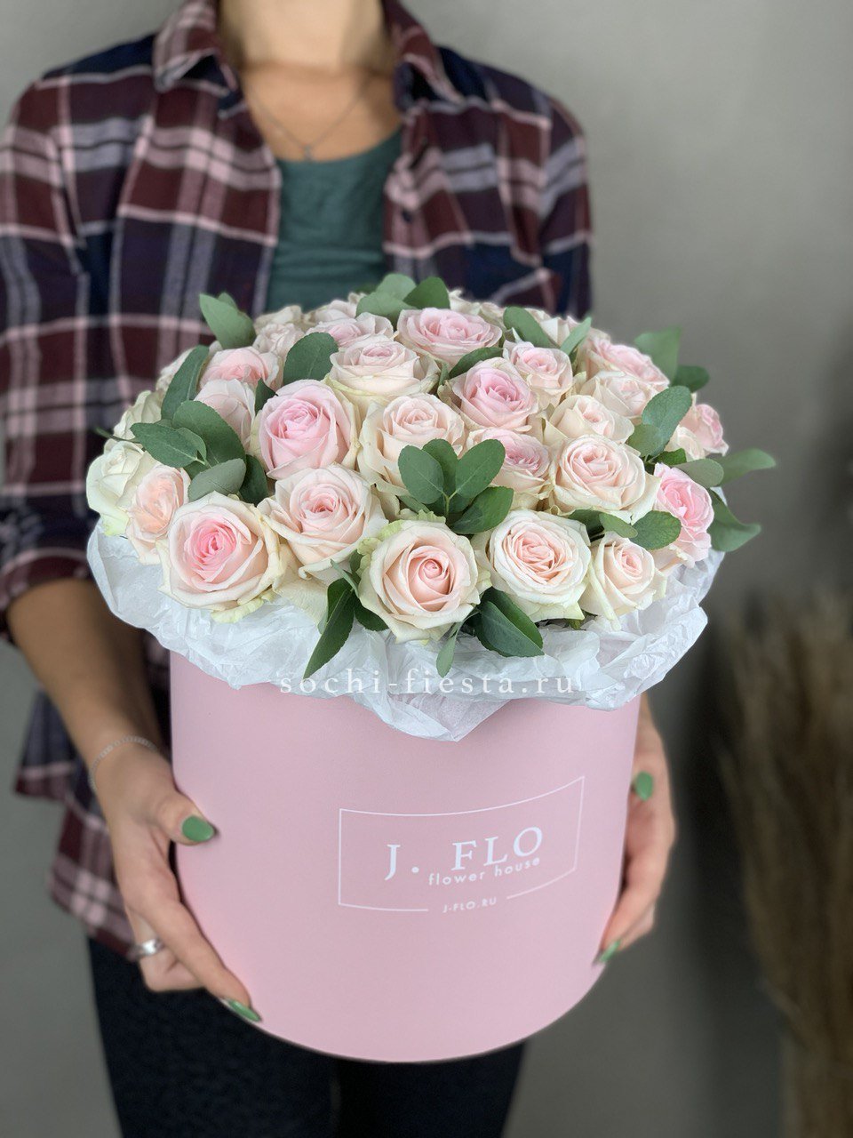 Тридцать пять бутонов розового оттенка выстраиваются в ровный купол. Эвкалипт мини проходит между розами и освежает композицию. Цилиндр сохраняет воду и позволяет цветам оставаться свежими.