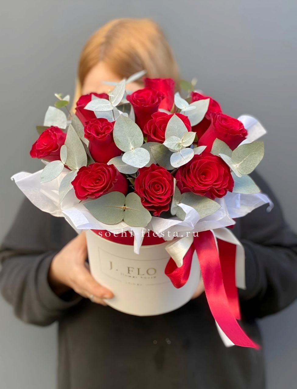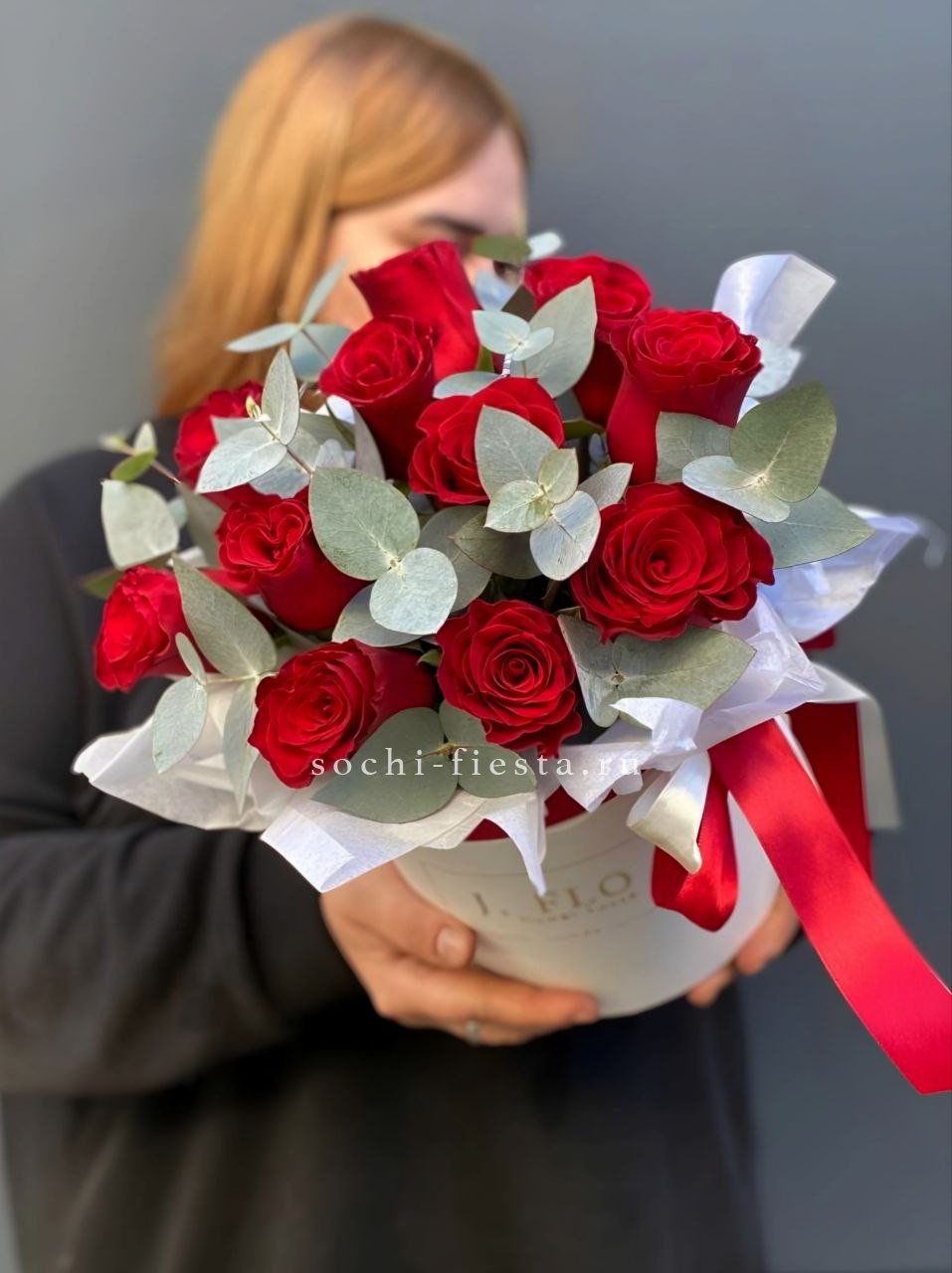 нежно-розовые розы, эвкалипт мини, цилиндр D20-25.