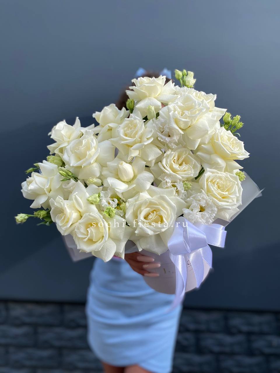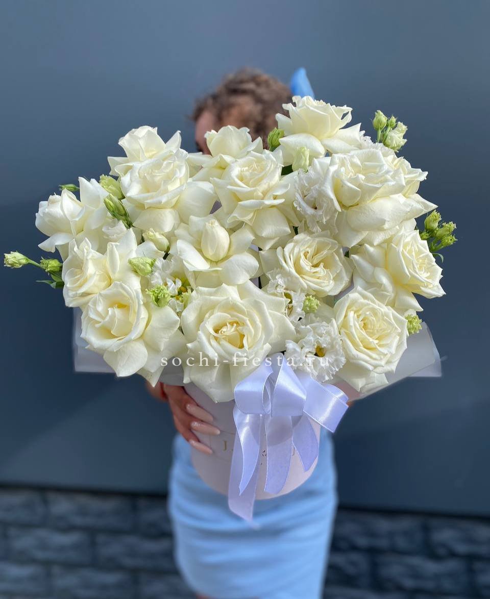 эустома, пионовидная кустовая роза, белая роза, хлопок, эвкалипт, бокс 13.