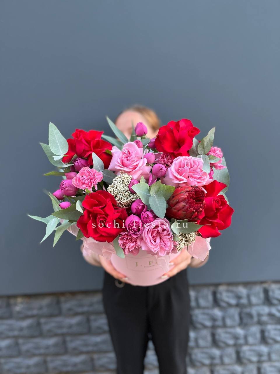 Красные и розовые розы создают яркую игру оттенков в просторном боксе. Диантус и озотамнус добавляют воздушности, мисти баблс расставляет акценты.