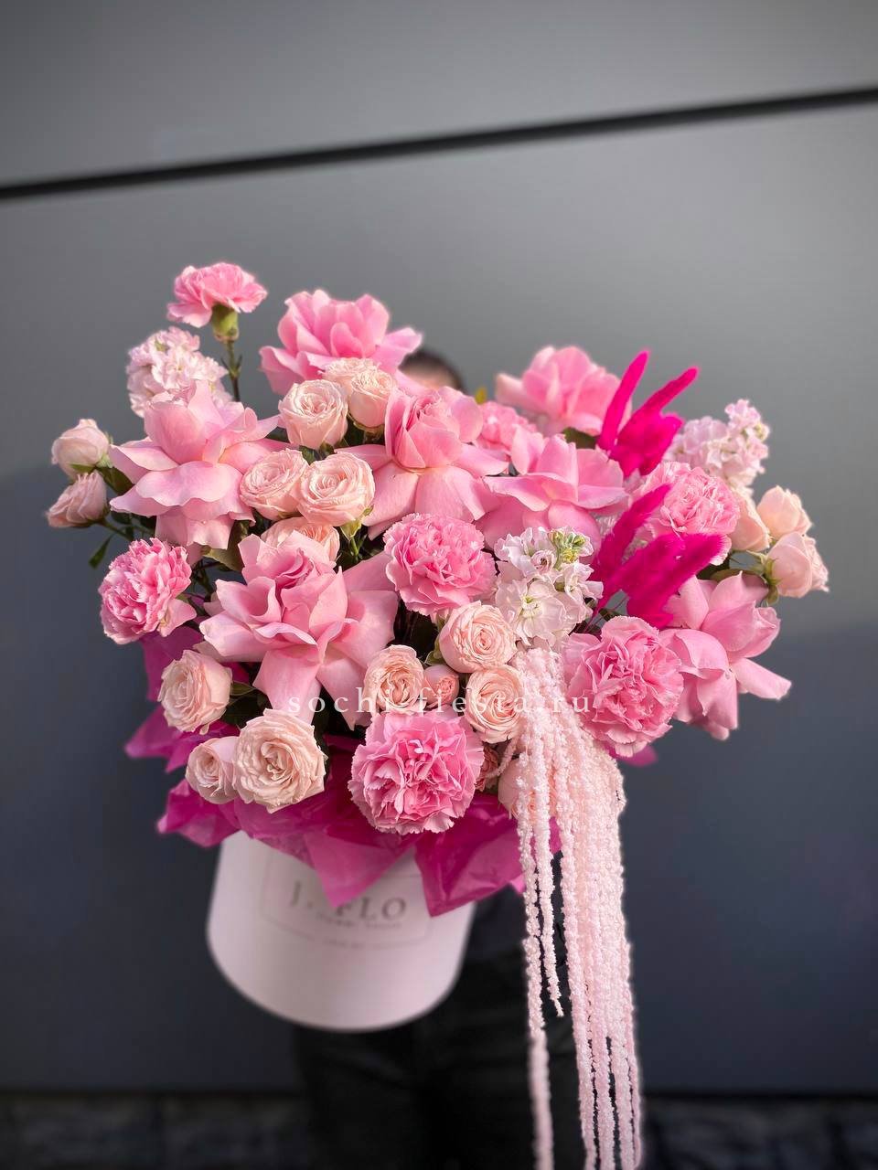 французские розы, кустовые розы, диантусы, матиолла, лагурус, цилиндр D20,  бумага тишью.