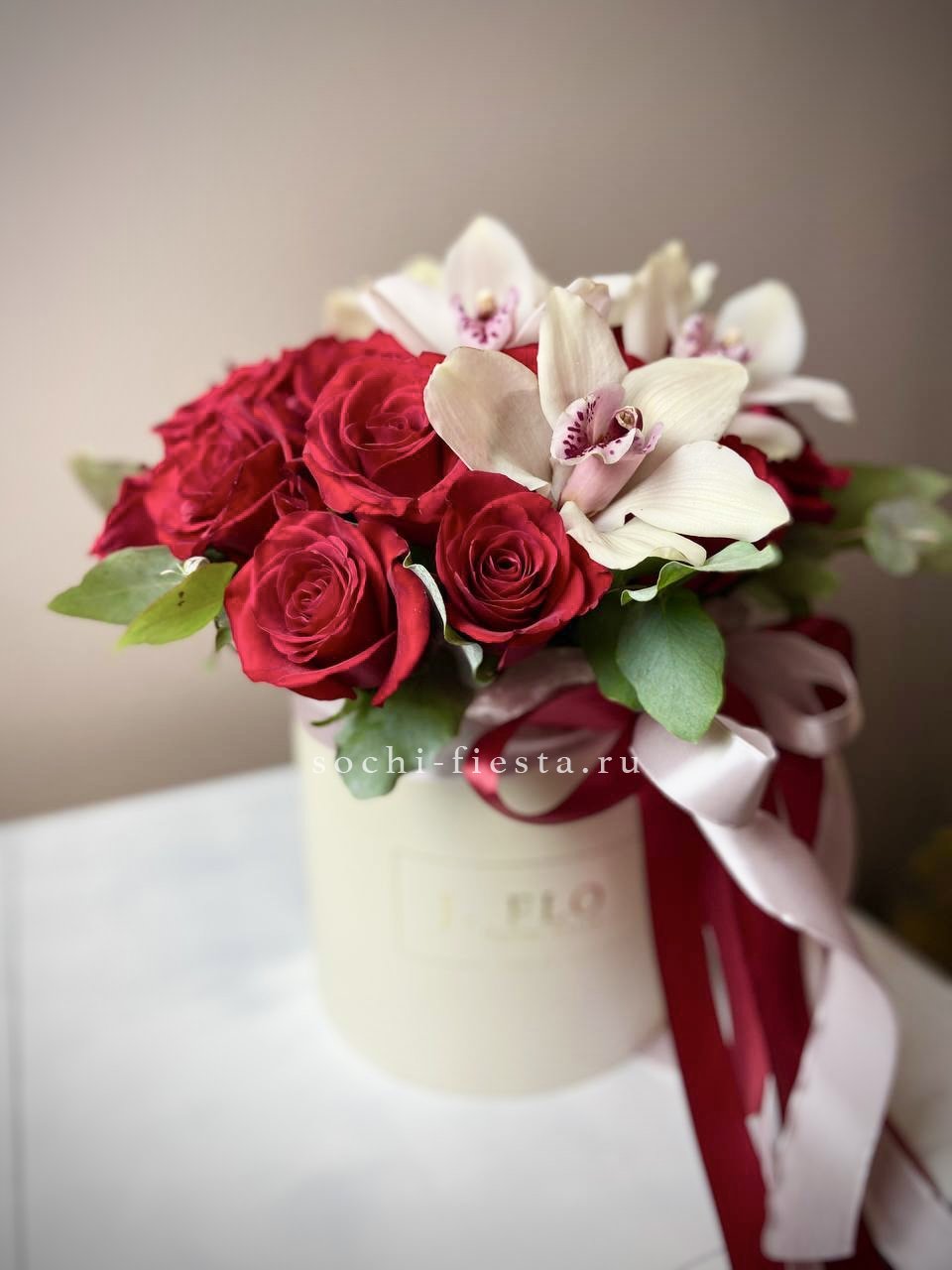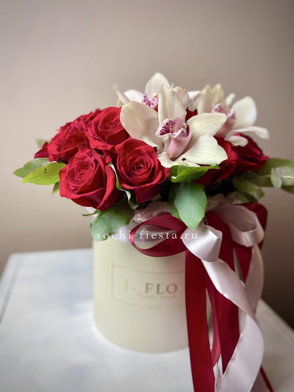 выполнен из эустом, французских роз, эвкалипт, цилиндр D20.