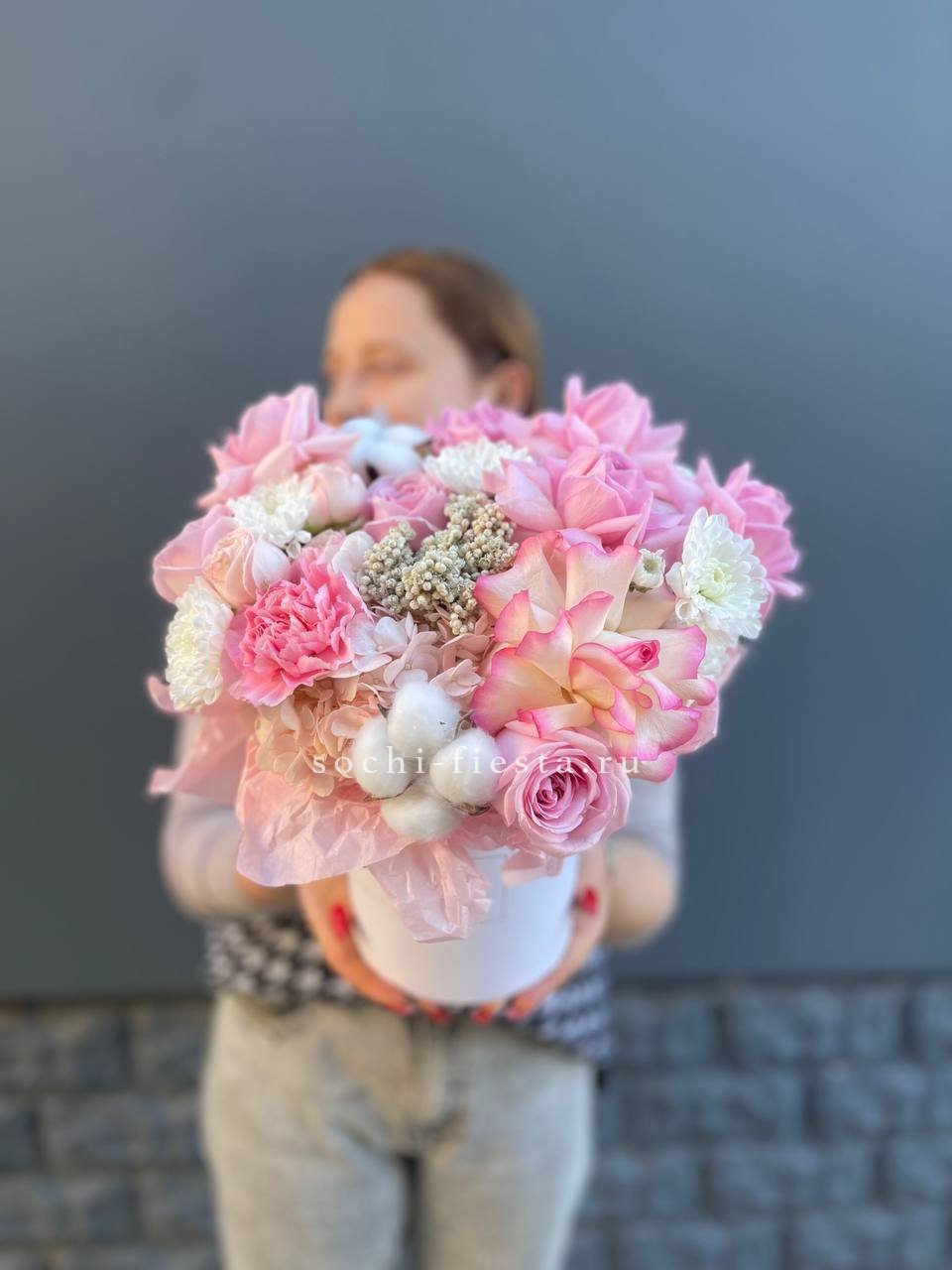 цветочная композиция в розово-белых тонах в розовом цилиндре D20-25.