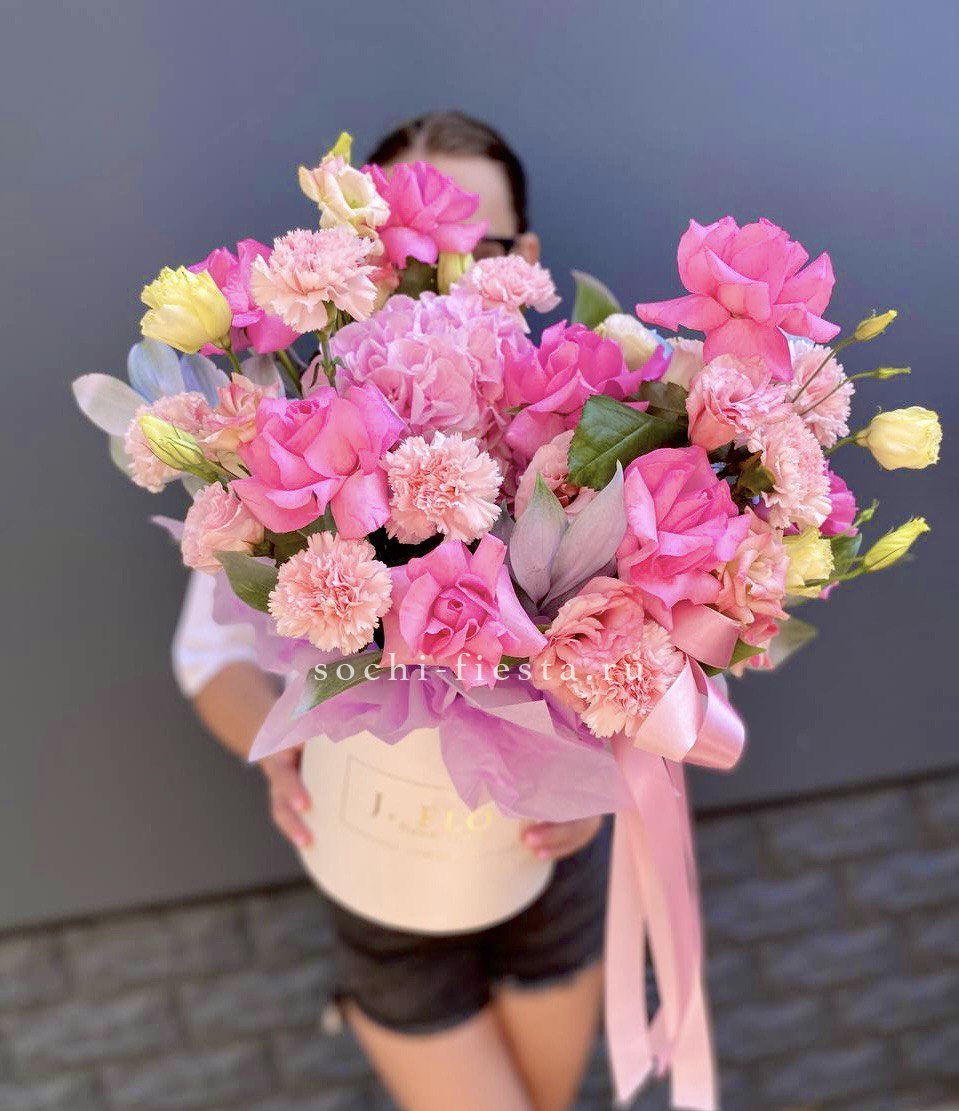 выполнен из гортензии, эустом, диантусов, французских роз, эвкалипт, цилиндр D20.