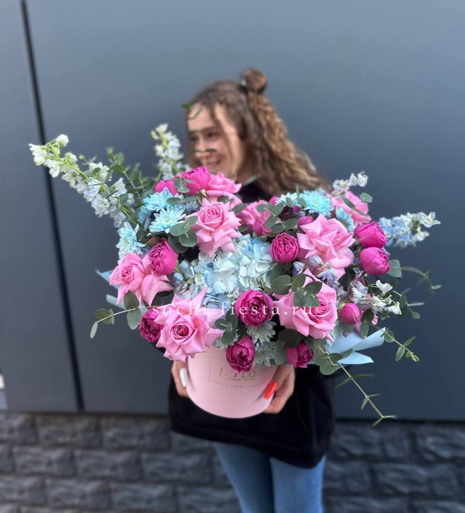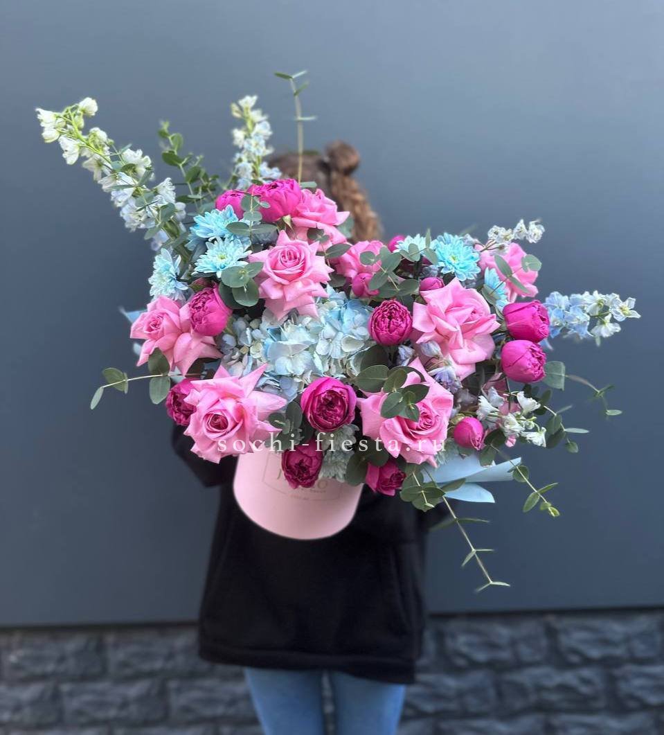 Воздушная гортензия встречается с плотными бутонами французских роз и миниатюрными диантусами. Эустома добавляет объема, а эвкалипт создает свежую основу для всей композиции в цилиндре.