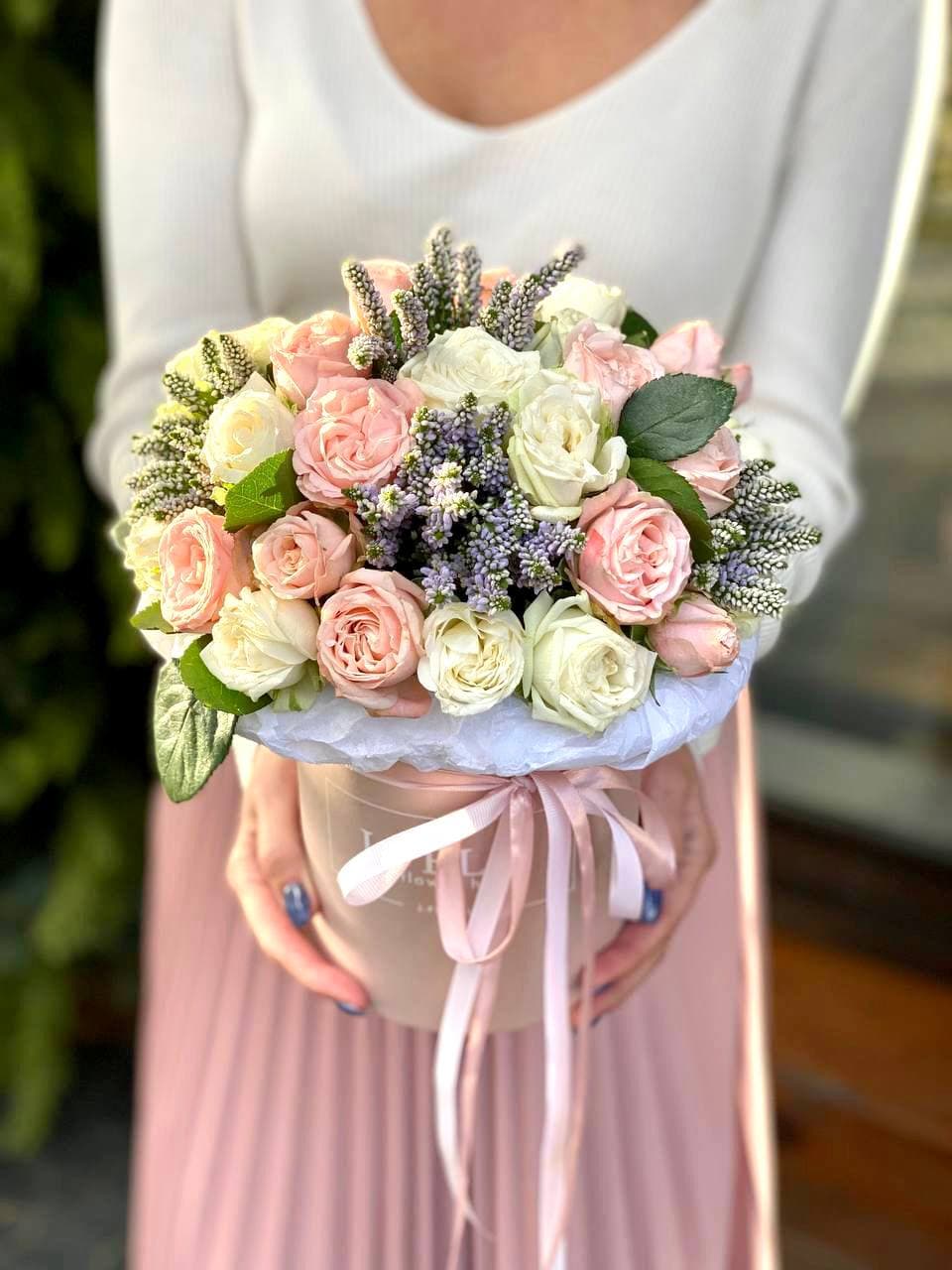 Семнадцать белых роз с раскрытыми лепестками собраны в круглый бокс с добавлением эвкалипта. Композиция держит форму и легко размещается на столе или комоде. Практичное решение для тех, кто ценит аккуратность и свежесть без лишних деталей.