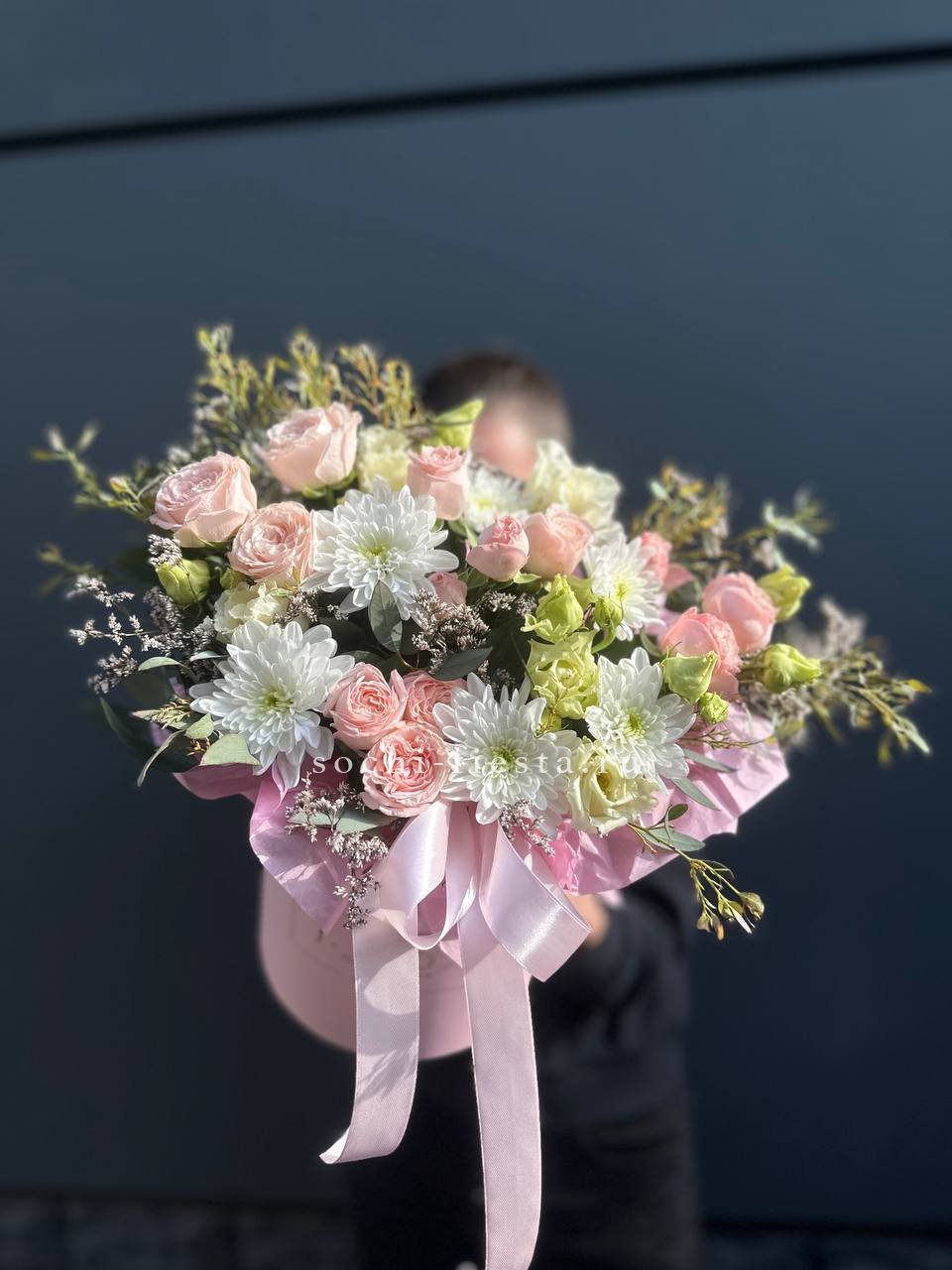 Хризантемы раскрыты полностью, каждый цветок виден отдельно. Коробка фиксирует стебли и позволяет поставить композицию на любую поверхность без вазы. Компактное решение для дома или офиса.