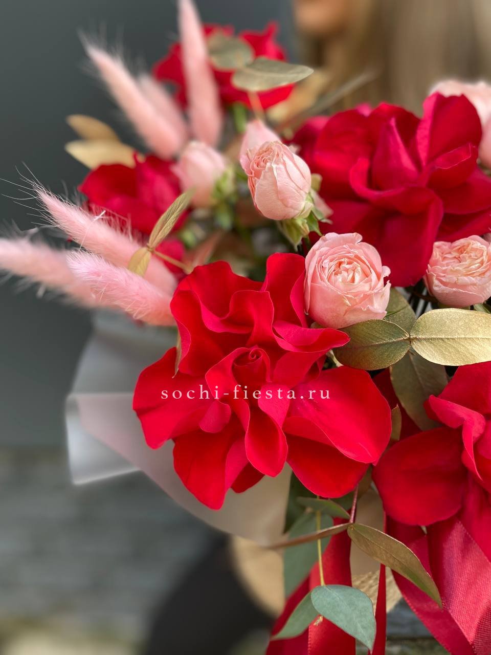 Красные розы и бомбастик выделяются на фоне золотистого эвкалипта и пушистого лагуруса. Тёплая гамма и разнообразие текстур собраны в компактную композицию с выразительным характером.
