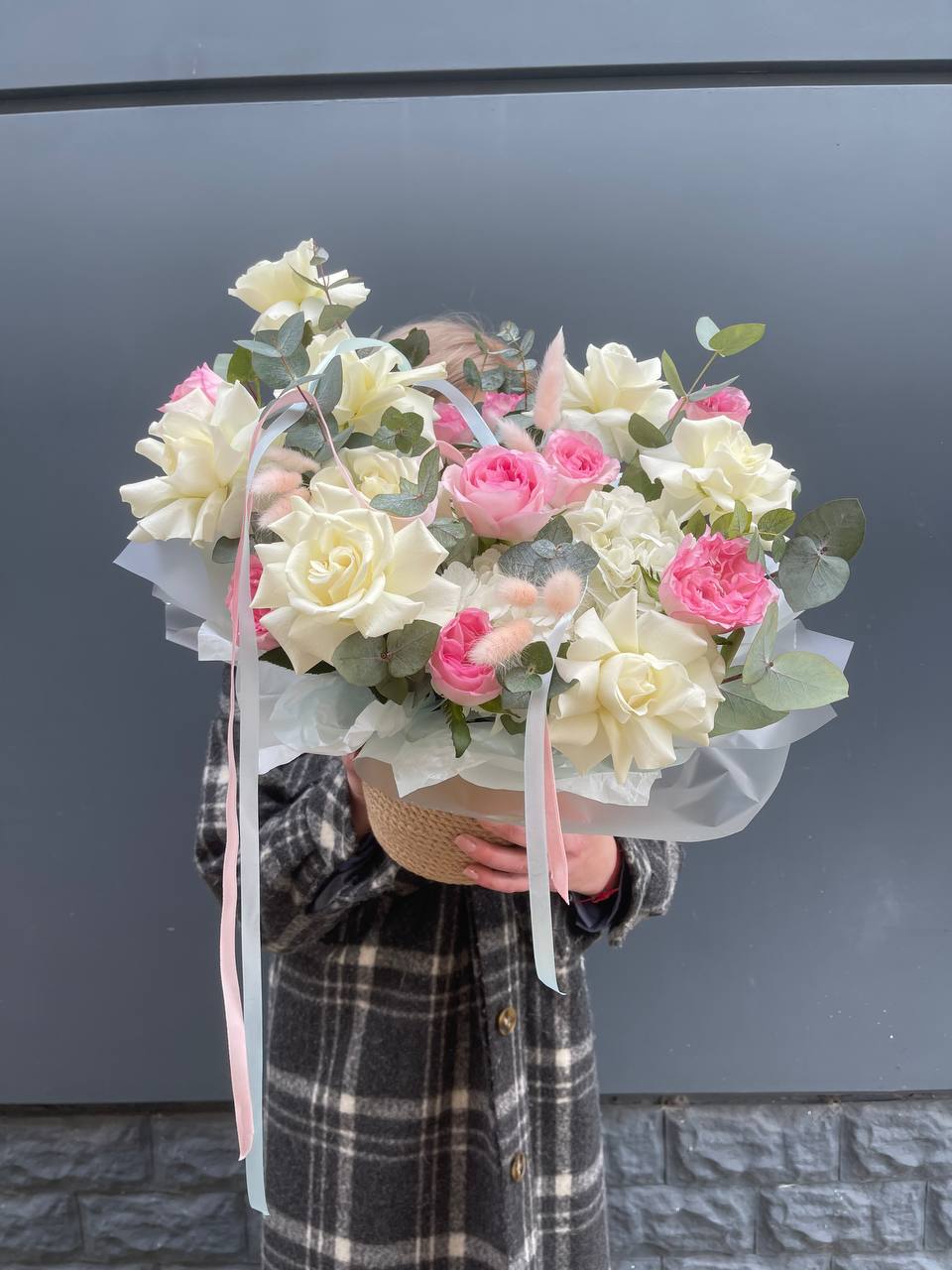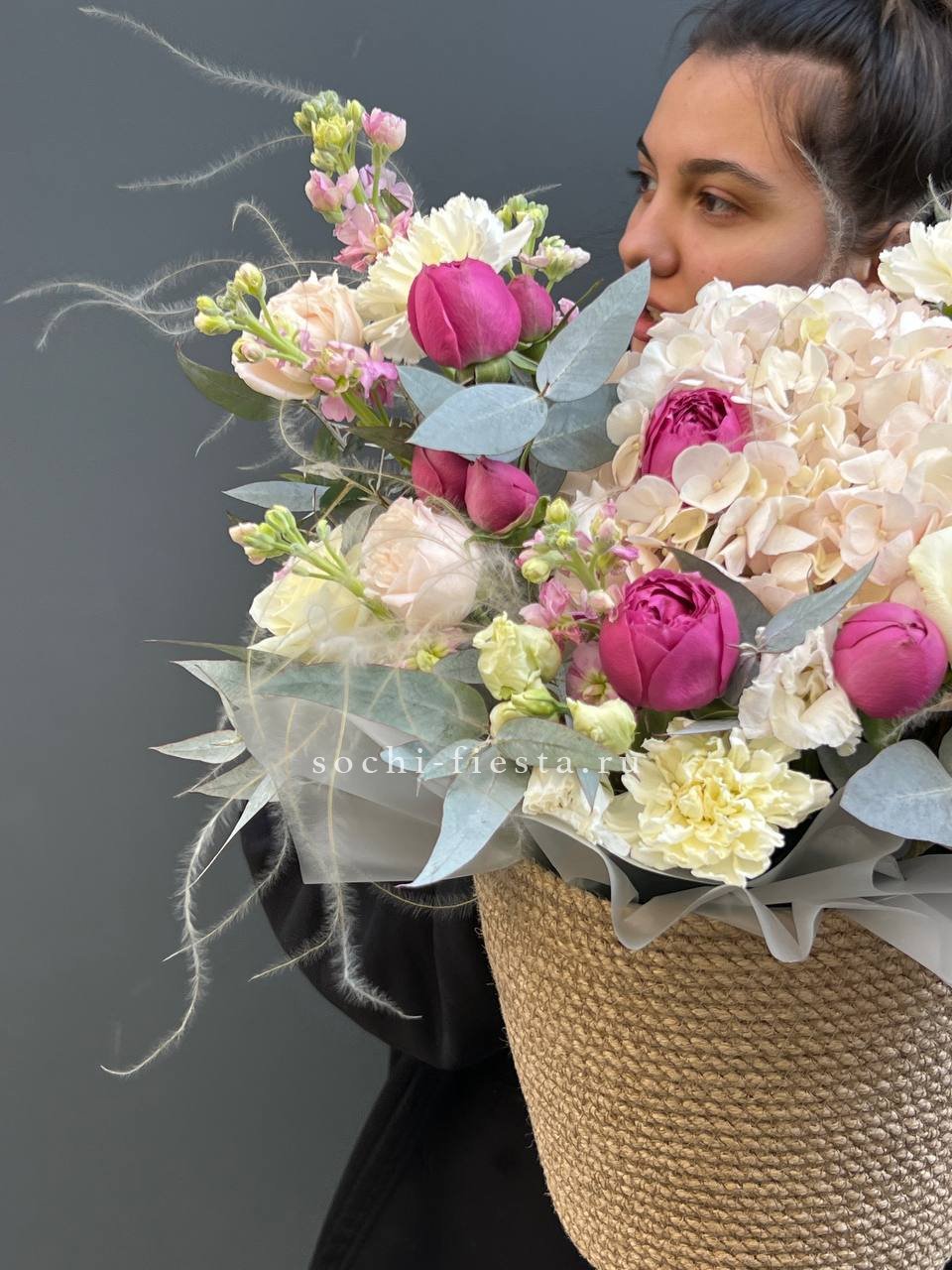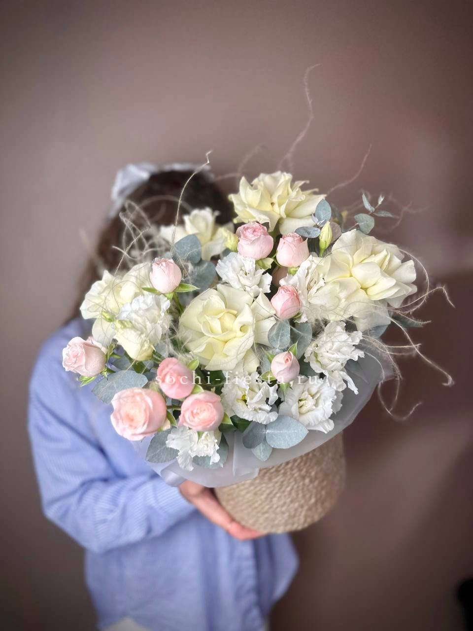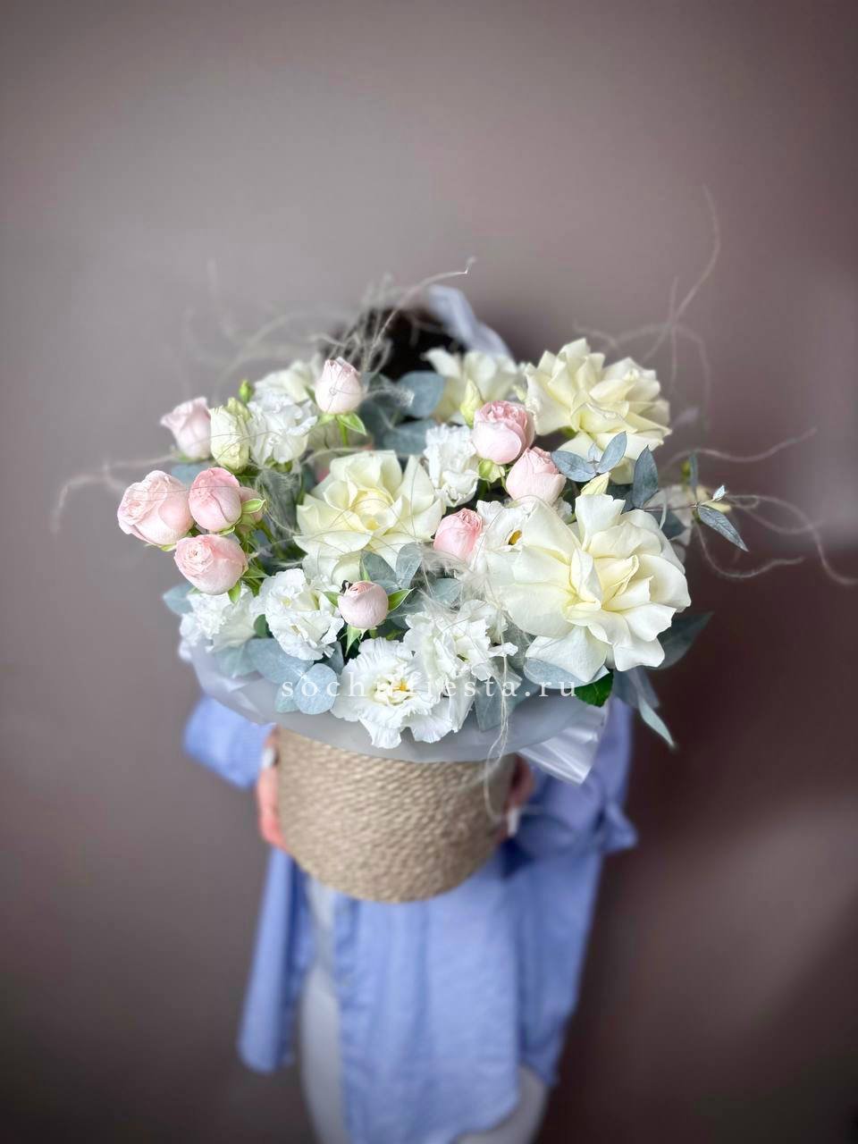 пионовидные розы Мисти Бабблс, джутовое кашпо, стифа, эвкалипт.