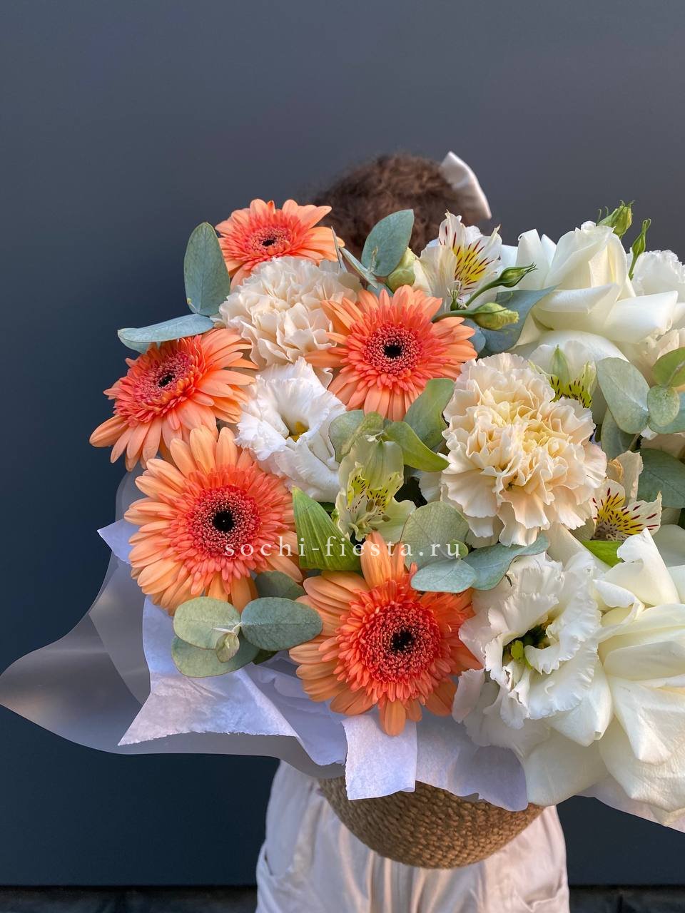 Белые розы и яркие герберы встречаются в одной композиции с диантусами и эустомой. Эвкалипт добавляет зелени, а джутовое кашпо завершает природный образ букета Georgino.