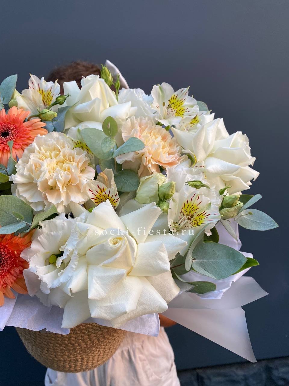 белые розы, герберы, диантусы, эустома, эвкалипт, джутовое кашпо.