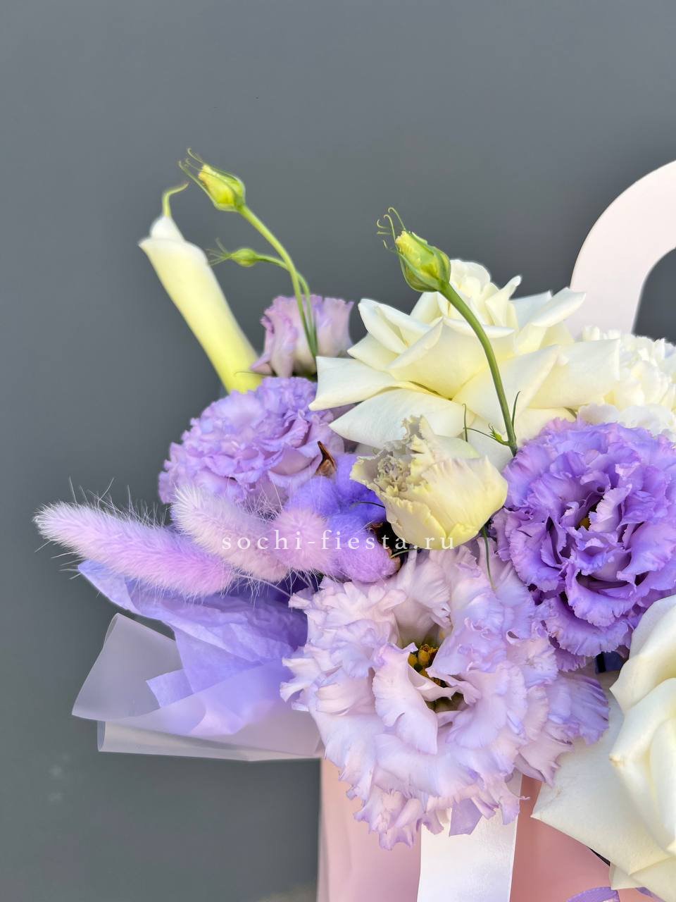 эустома, маттиола, белые розы, хлопок, лента, сумка-кашпо.