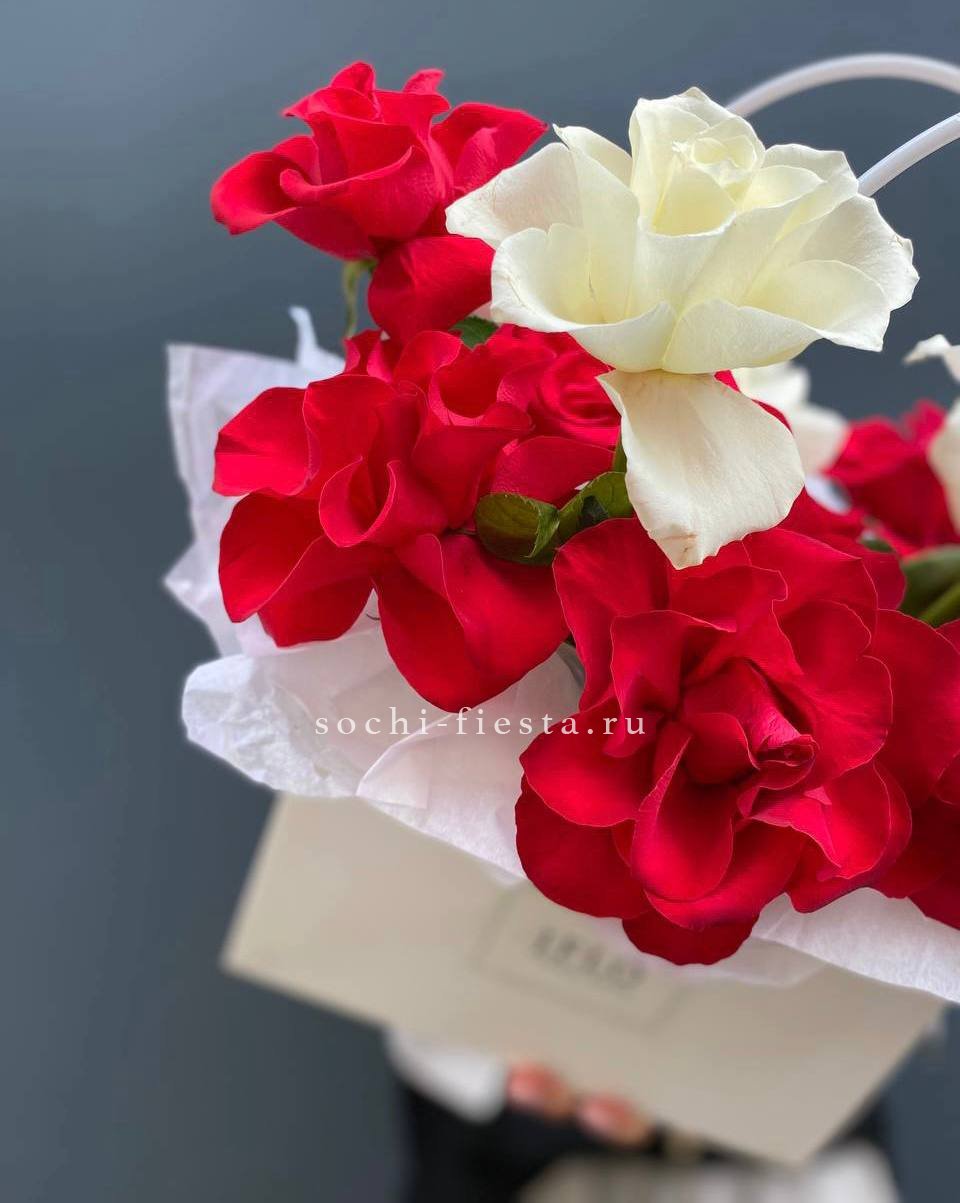 Французские розы двух оттенков собраны плотной шапкой в компактной сумочке. Белый и красный создают чёткий визуальный ритм без лишних деталей. Формат удобен для подарка или украшения пространства.