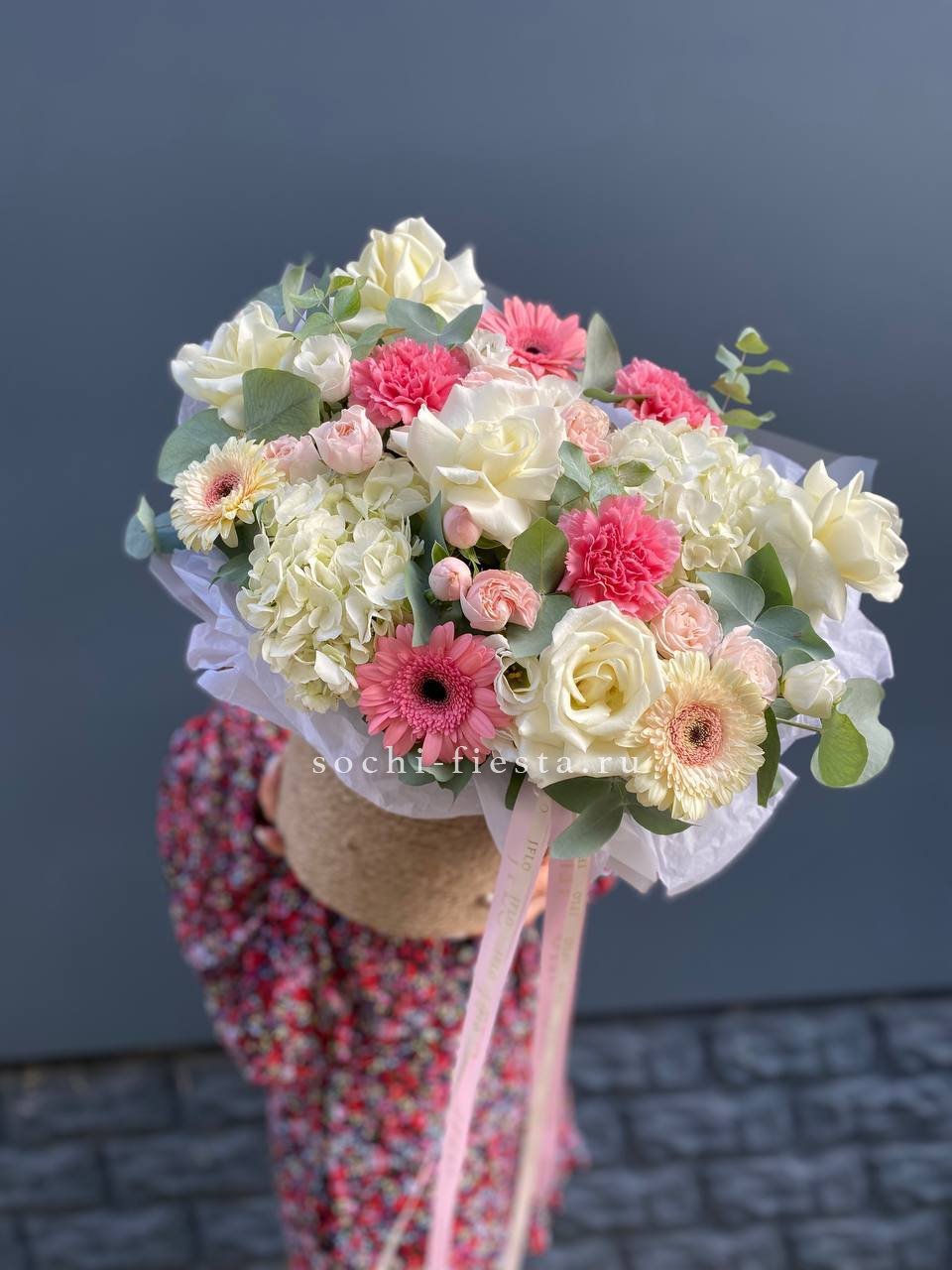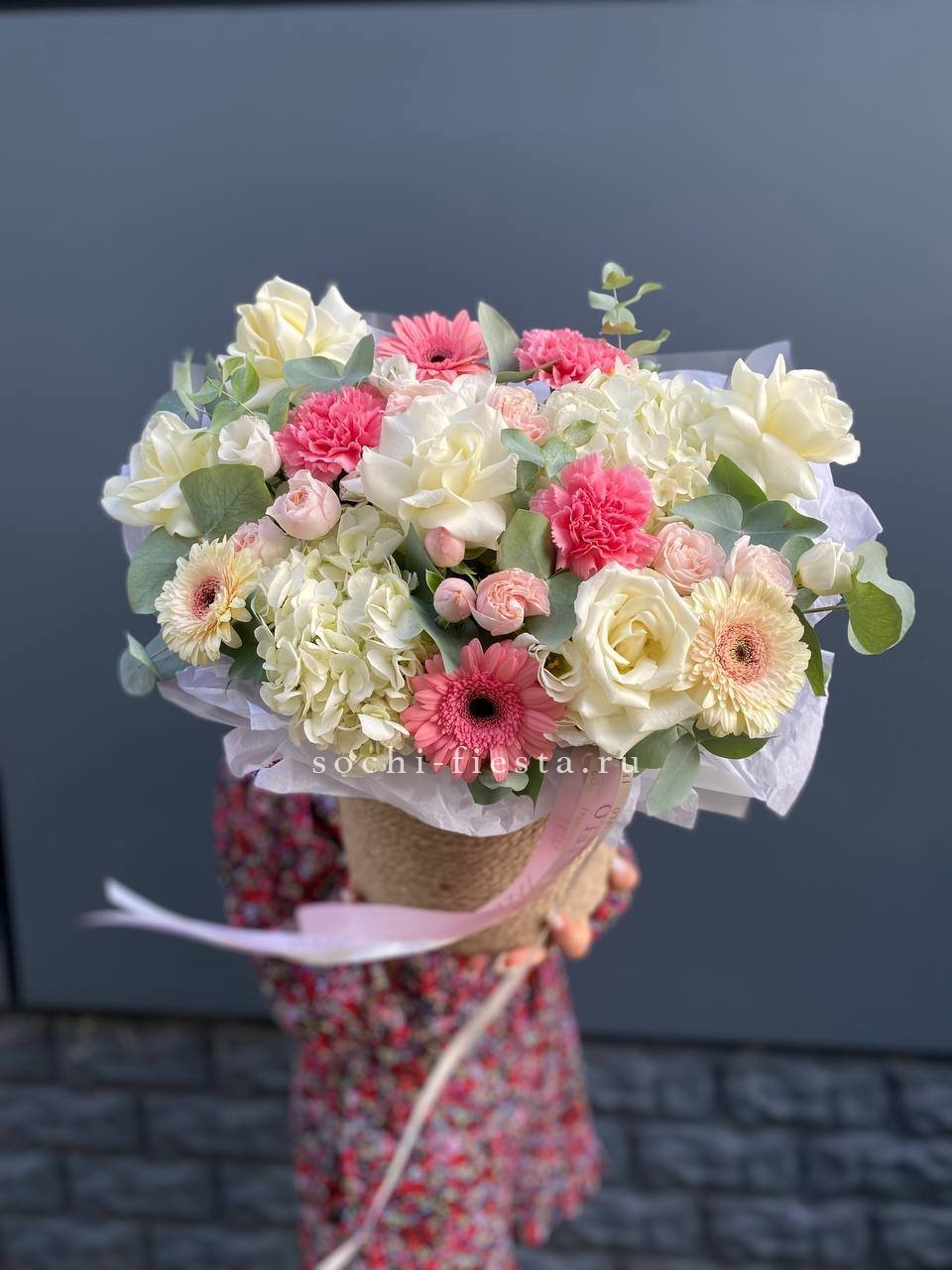 Этот букет создан, чтобы заряжать позитивом! Яркие акценты розовых гербер и теплые оттенки кремовых роз, в обрамлении свежей зелени, создают ощущение солнечного дня и беззаботного счастья. Это не просто цветы, а концентрат радости, который мгновенно поднимет настроение и добавит ярких красок в жизнь.
