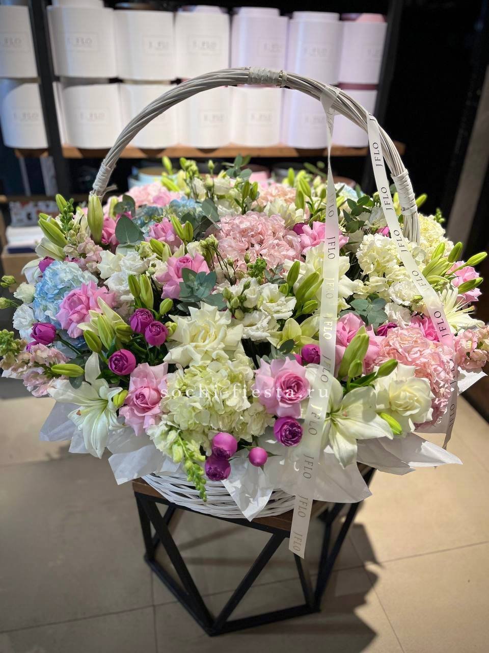 Корзина с шестьюдесятью пятью кустовыми розами Мисти Бабблс создаёт плотное облако из махровых бутонов лавандового оттенка. Эвкалипт добавляет свежести и завершает композицию.