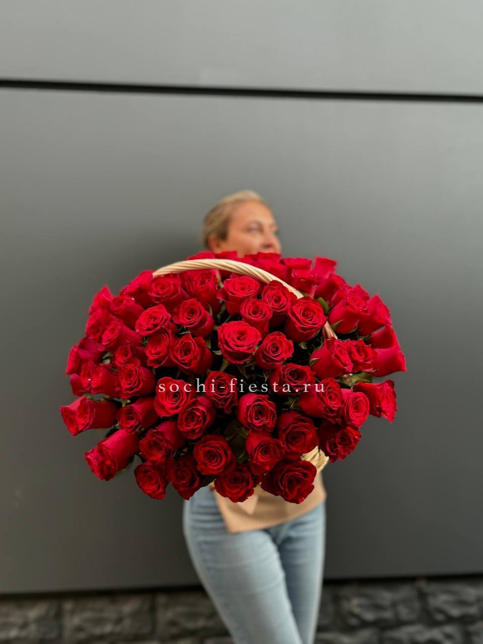 Пятьсот пять алых бутонов собраны в масштабную корзину, которая заполняет пространство цветом и объемом. Это композиция, которая говорит сама за себя своим количеством и насыщенностью.