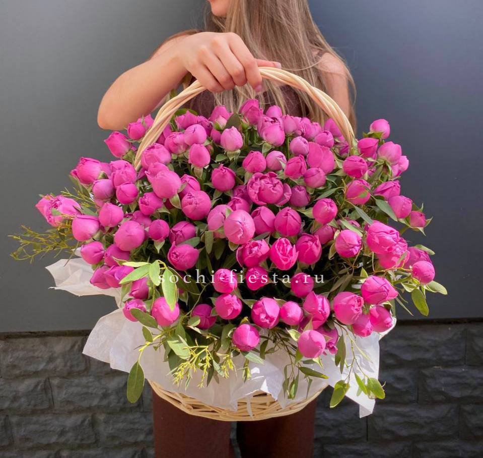 Пышная корзина с розами и гортензией раскрывается мягкими переходами розовых тонов. Эустома и диантус добавляют воздушности, а эвкалипт создает свежую основу для многослойной композиции. Авторская работа для важных событий и значимых встреч.