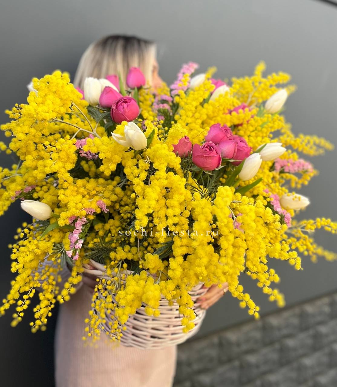 Солнечная мимоза встречается с тюльпанами и пионовидными розами Мисти Бабблс. Весенняя палитра собрана в корзине, где каждый цветок занимает свое место в общем ритме.